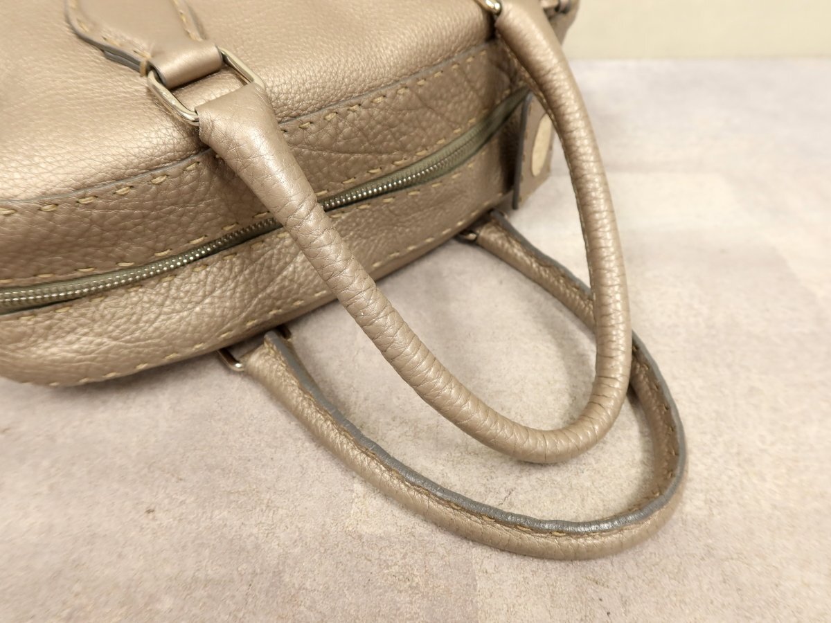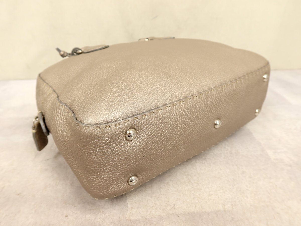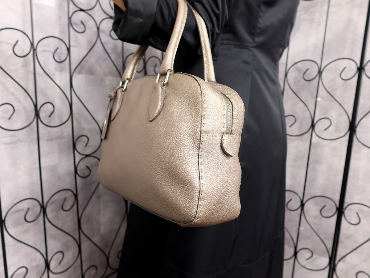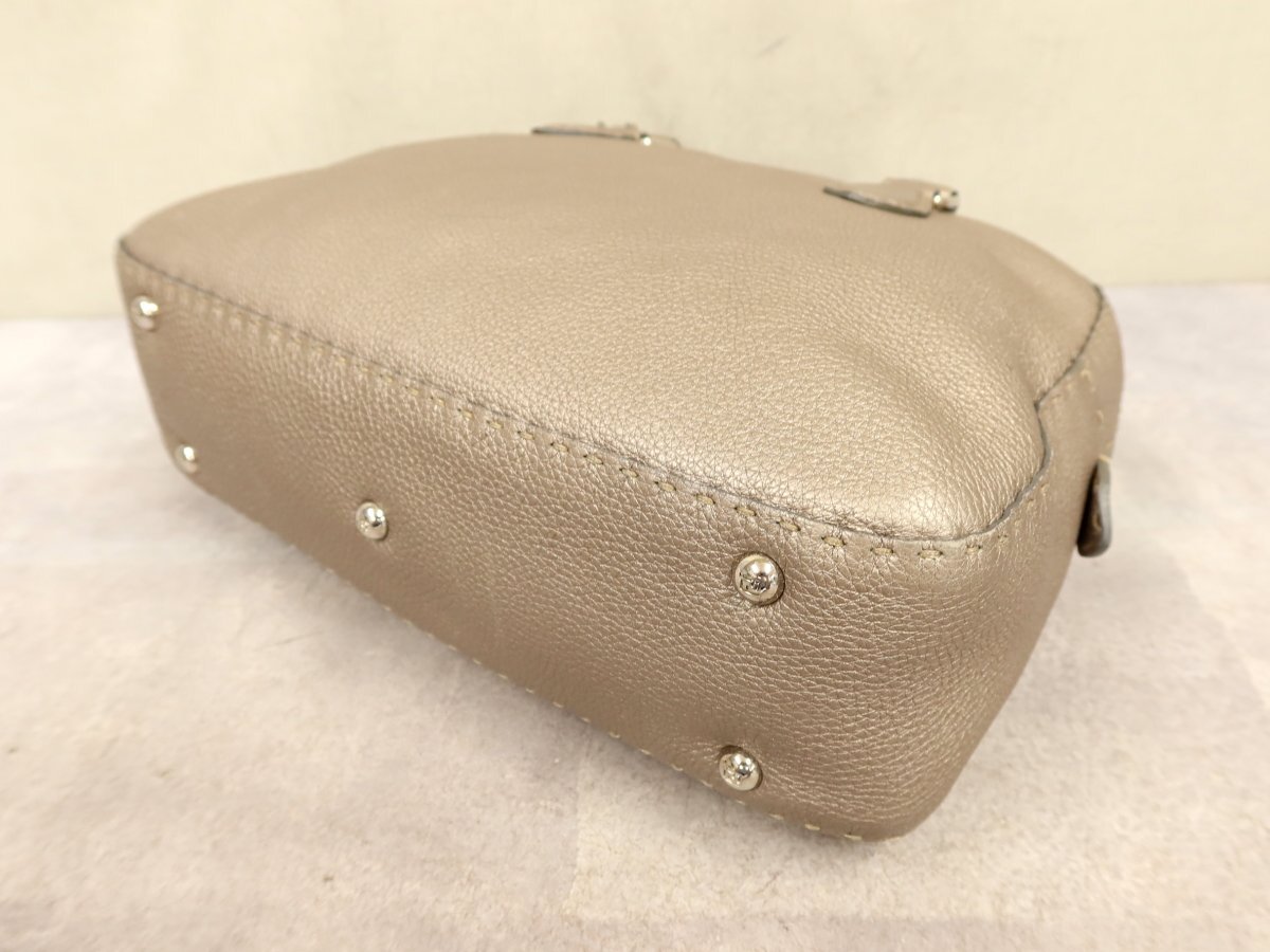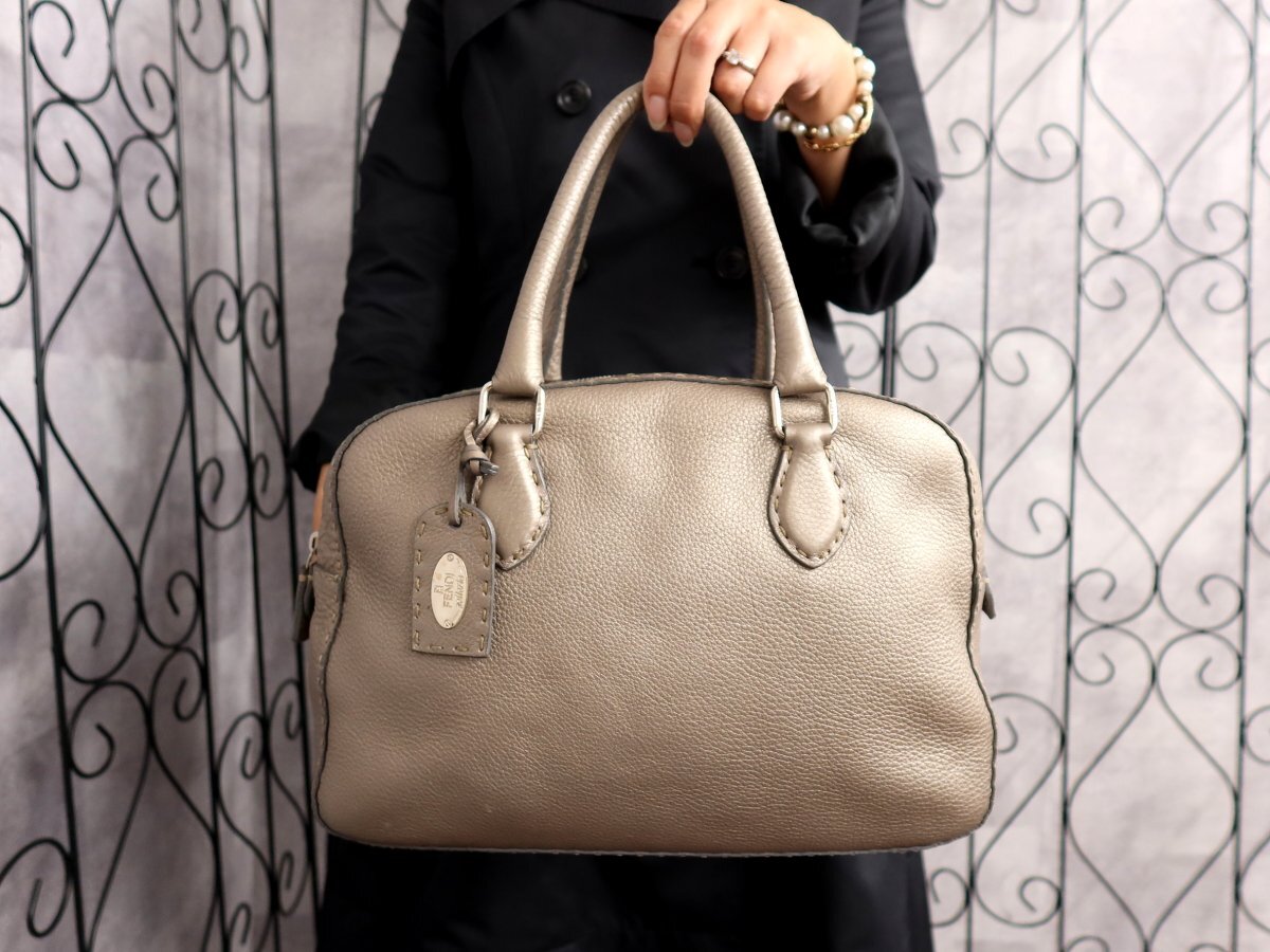 ●超美品●FENDI フェンディ●セレリア●ロゴプレート●カーフ レザー●ハンド バッグ●メタリックグレージュ●シルバー金具●B5●Js62378