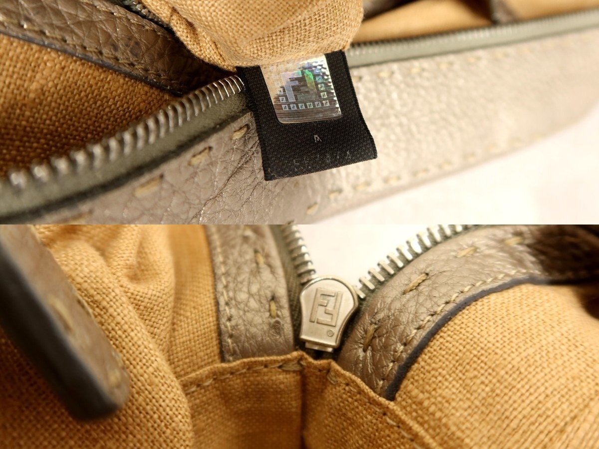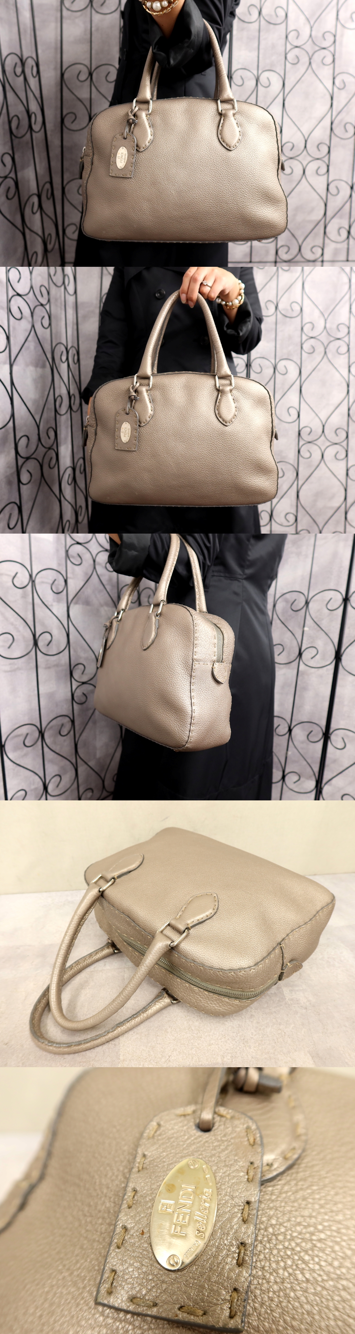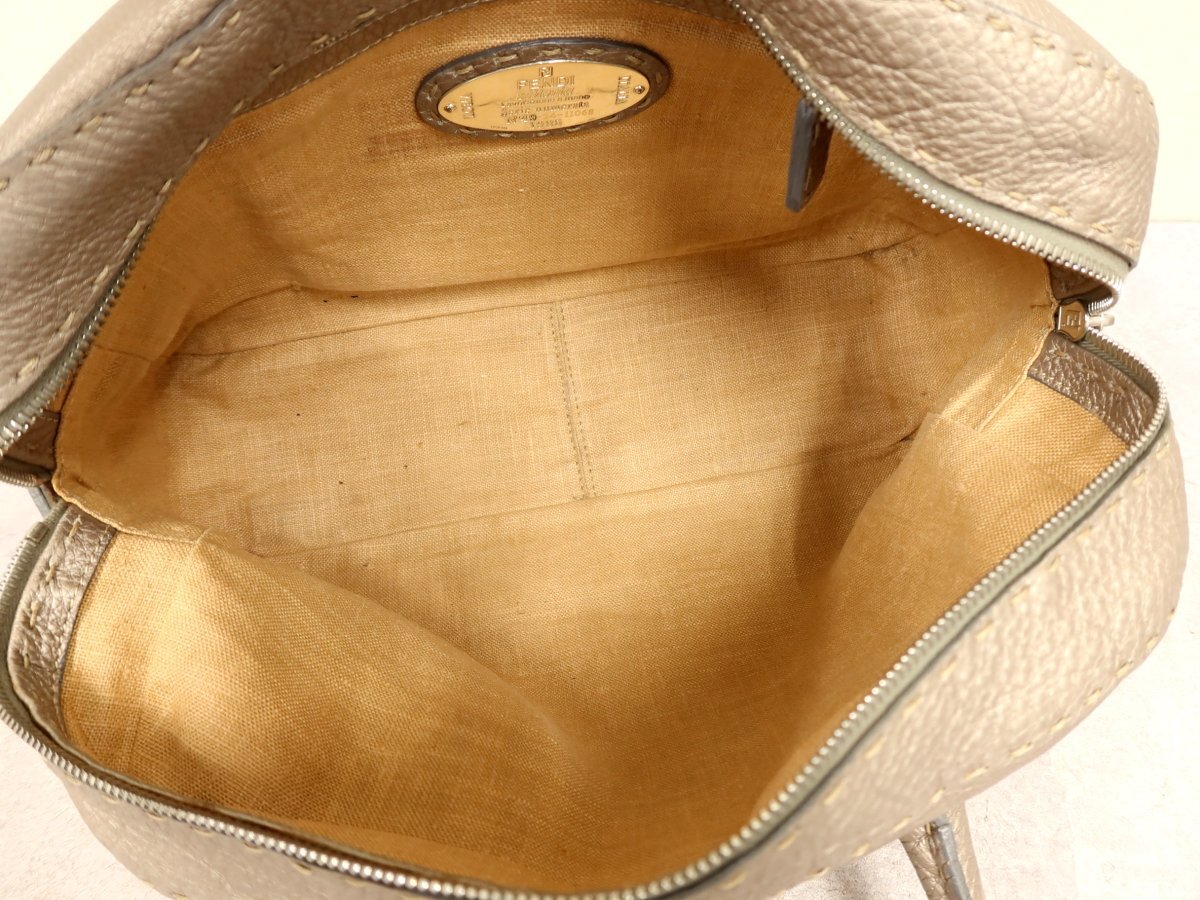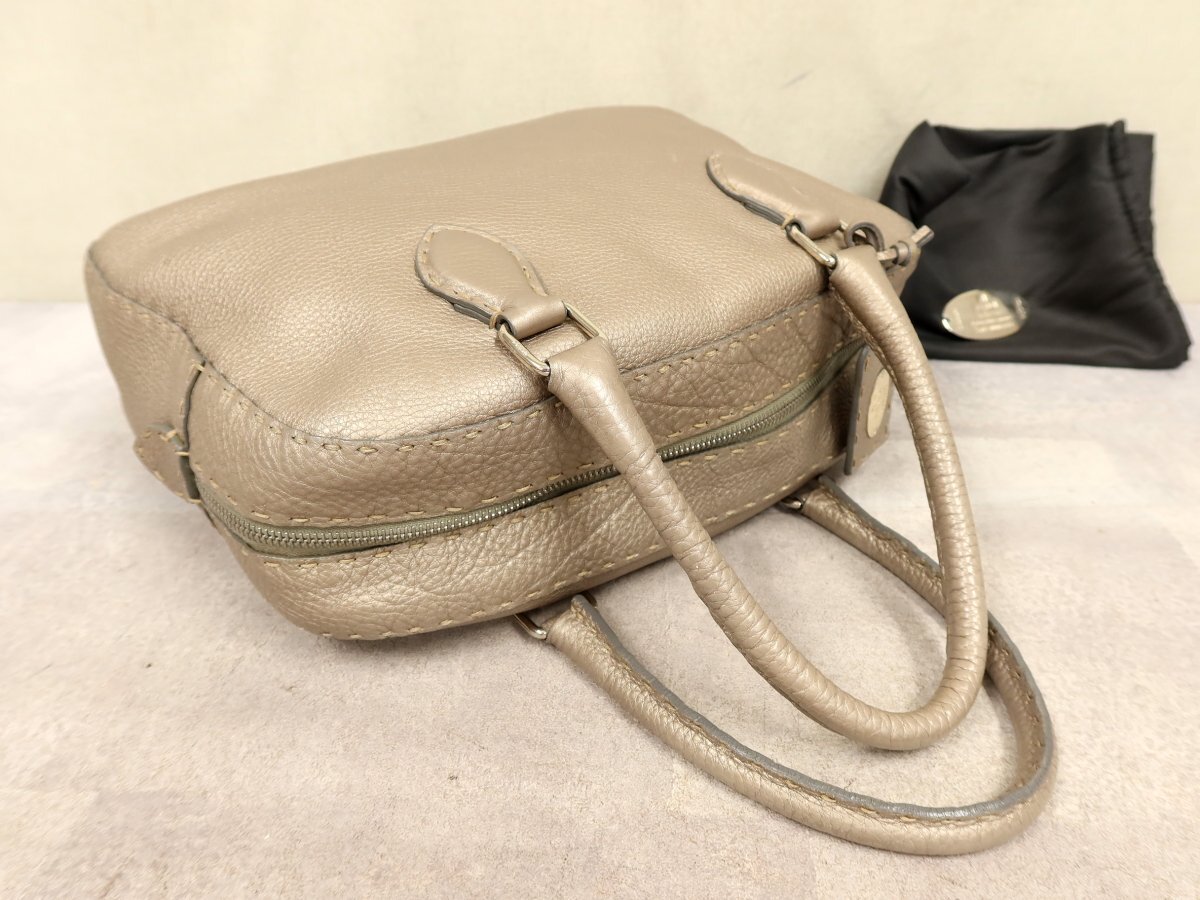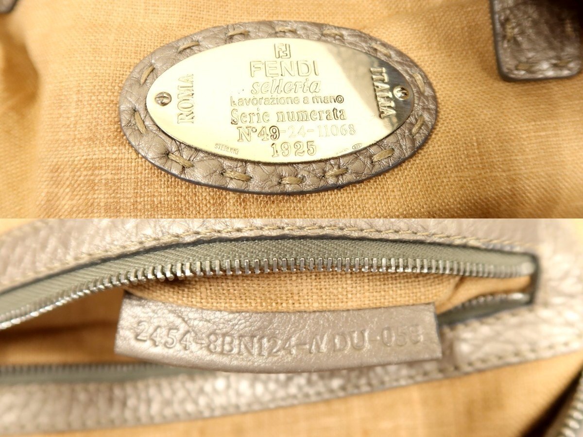 ●超美品●FENDI フェンディ●セレリア●ロゴプレート●カーフ レザー●ハンド バッグ●メタリックグレージュ●シルバー金具●B5●Js62378