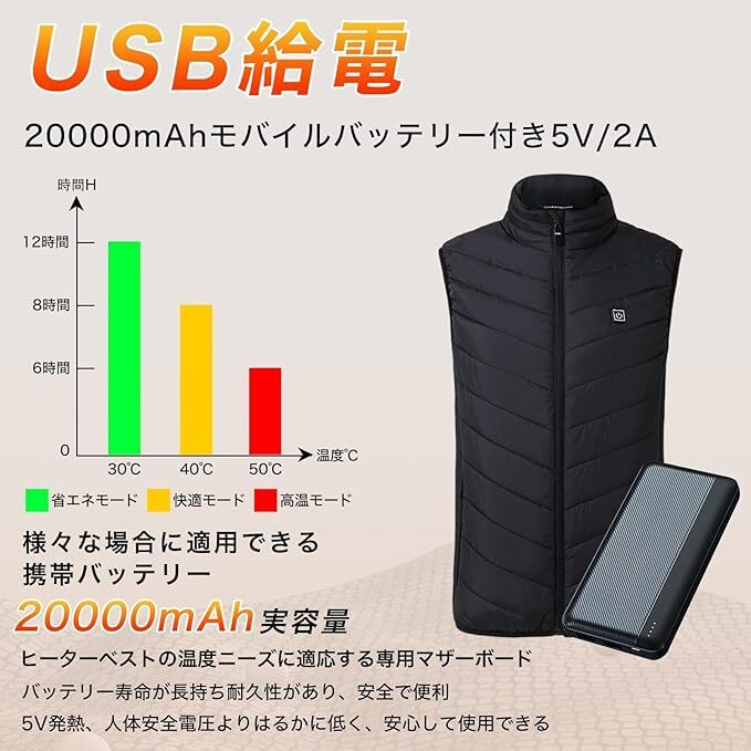 電熱ベスト 温熱ベスト Mサイズ 20000mahバッテリー 日本製ヒーター内蔵 前後9箇所発熱 3段階温度調整 USB給電 洗濯可 男女兼用 節電