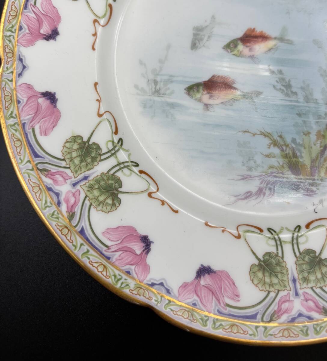 稀少なアールヌーボーのデザインです。真っ白な磁器に優しい色使いの絵付けが美しい一品です。周辺部は銅版の多色刷り、中央は泳ぐ魚の様子が手描きで描かれています。絵付師のサインも入っています。直径約23.5cm、高さ約2.5cm。バックスタンプは1892-1925年の間に使用されたものですが、デザインから、19世紀末アールヌーボー時代のものと思われます。