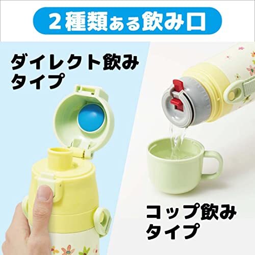 説明 直飲みもコップ飲みも両方できる水筒 冷たい飲み物がそのまま飲める 直飲みもコップ飲みもできる2WAYタイプ 不意にフタが開くのを防ぐロック機能付き 熱い飲み物はコップ飲みがおすすめ お子様から小学生にちょうど良い飲み切りサイズ350ml 肩から下げられるショルダーベルト、ネームプレート付き