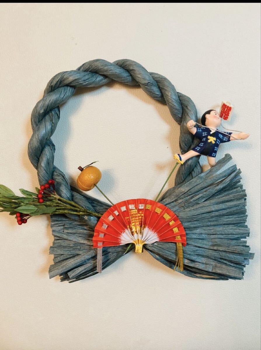 青い縄で編まれたしめ縄飾り、赤い扇子と男の子の人形付き。