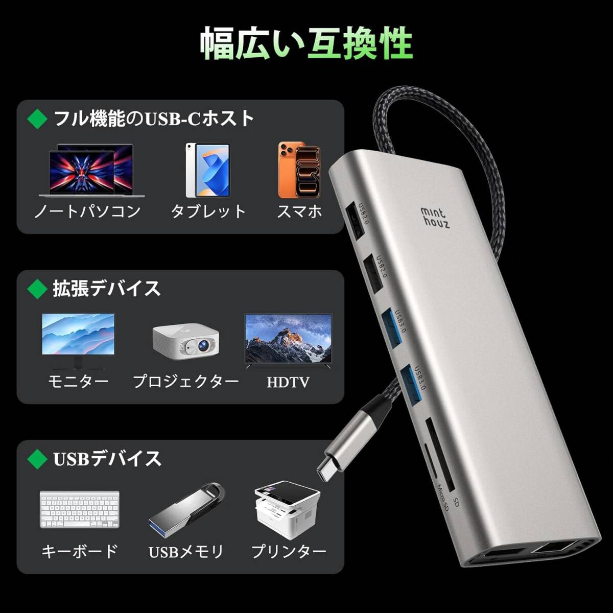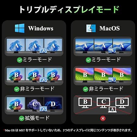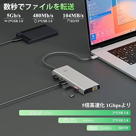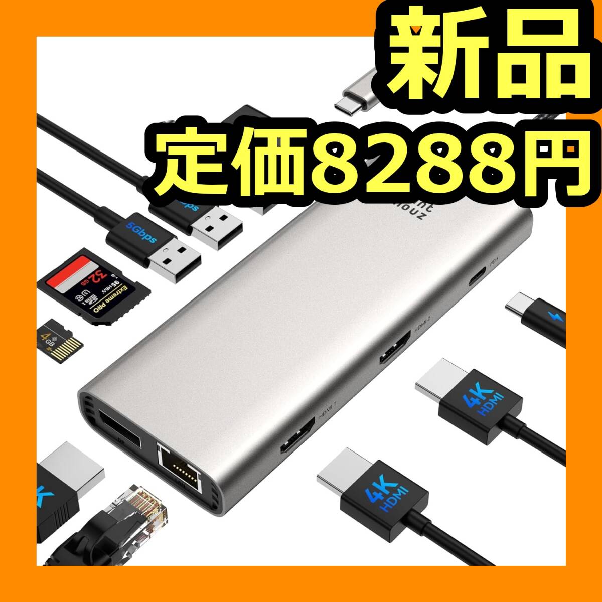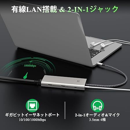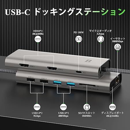 | 特徴 | 4K@60Hz HDMI 2つ+4K@144Hz DP、5Gbps 高速データ転送 、1000Mbps有線LAN、PD 100W高速充電、USB3.0*2+USB 2.0*2 |