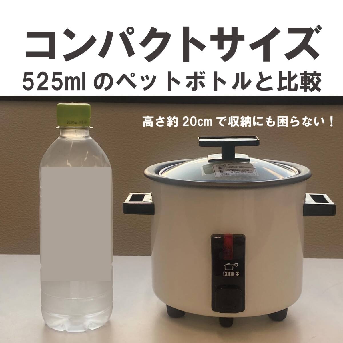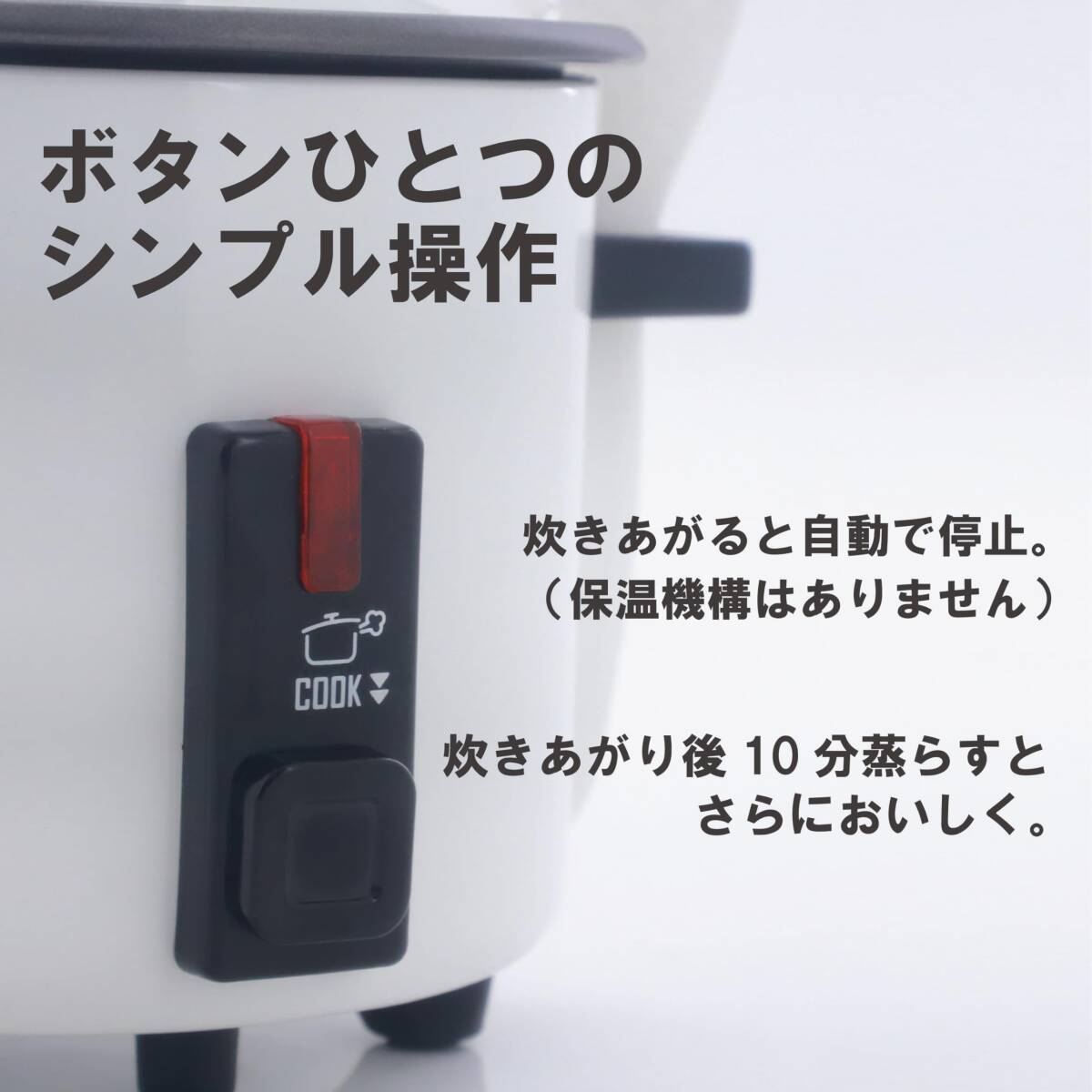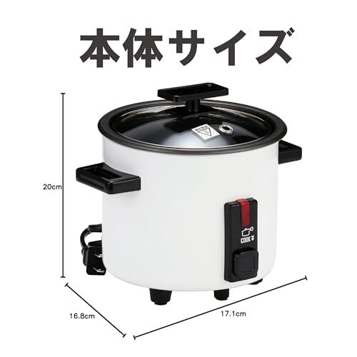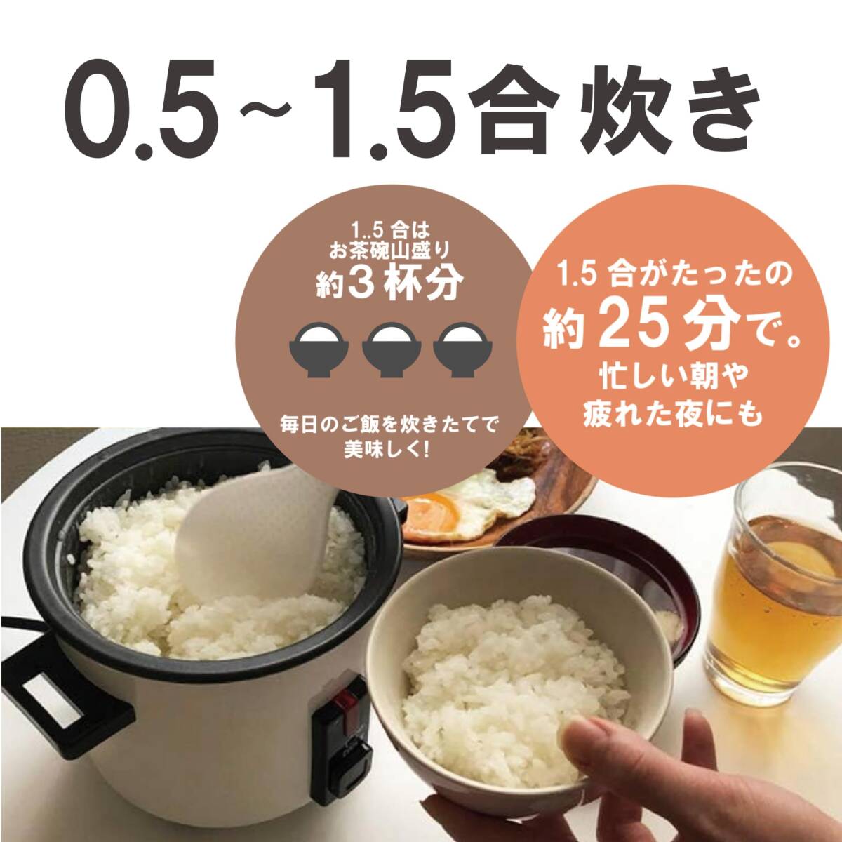 ●1~2人分でも、ふっくらおいしい。忙しい朝食、遅い夕食にも。 ●スイッチ1つで操作が簡単。 ●仕様 ・電源:AC100V 50/60Hz共用 ・消費電力:200W ・炊飯容量:0.5~1.5合 ・本体サイズ:約200(W)×168(D)×171(H)mm ・質量:約0.97kg ・付属品:計量カップ、しゃもじ