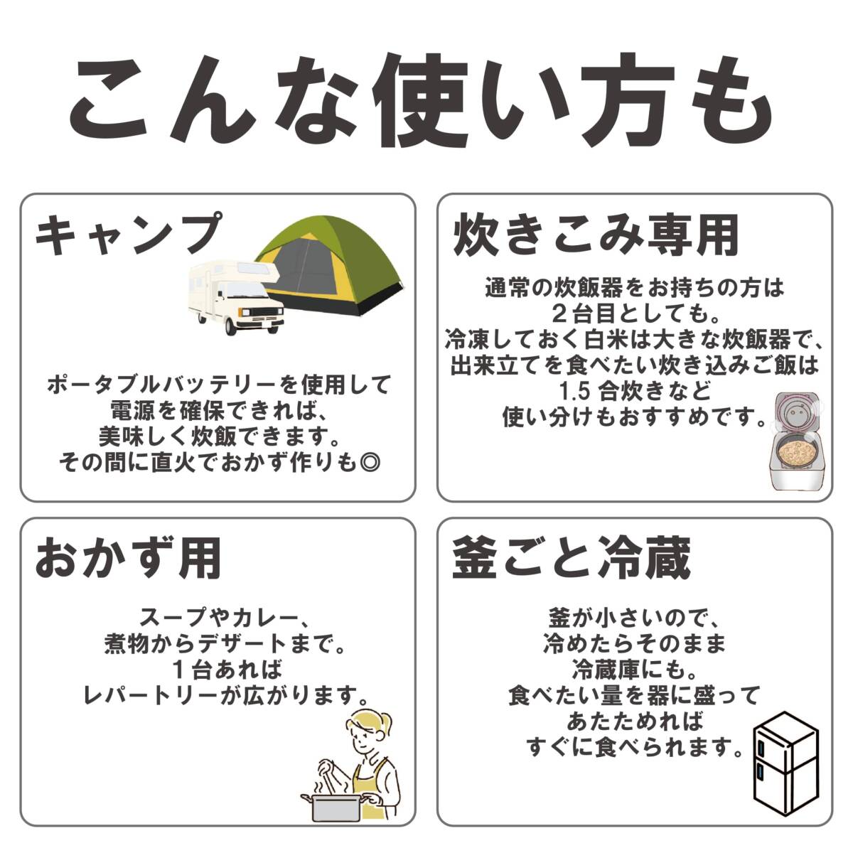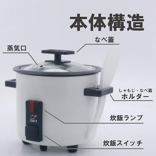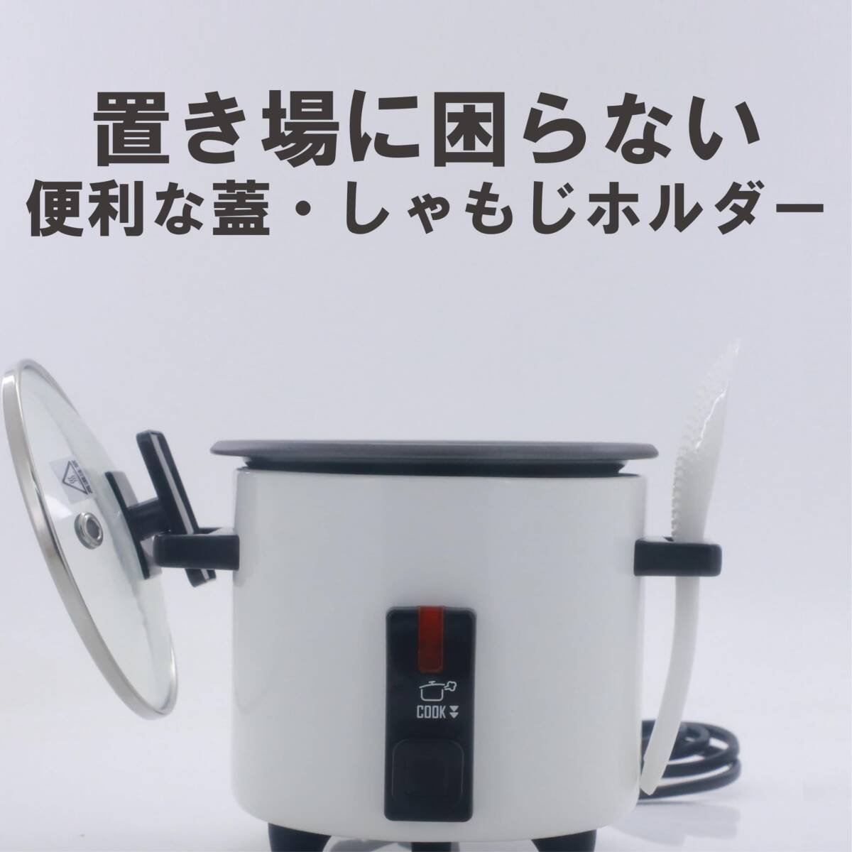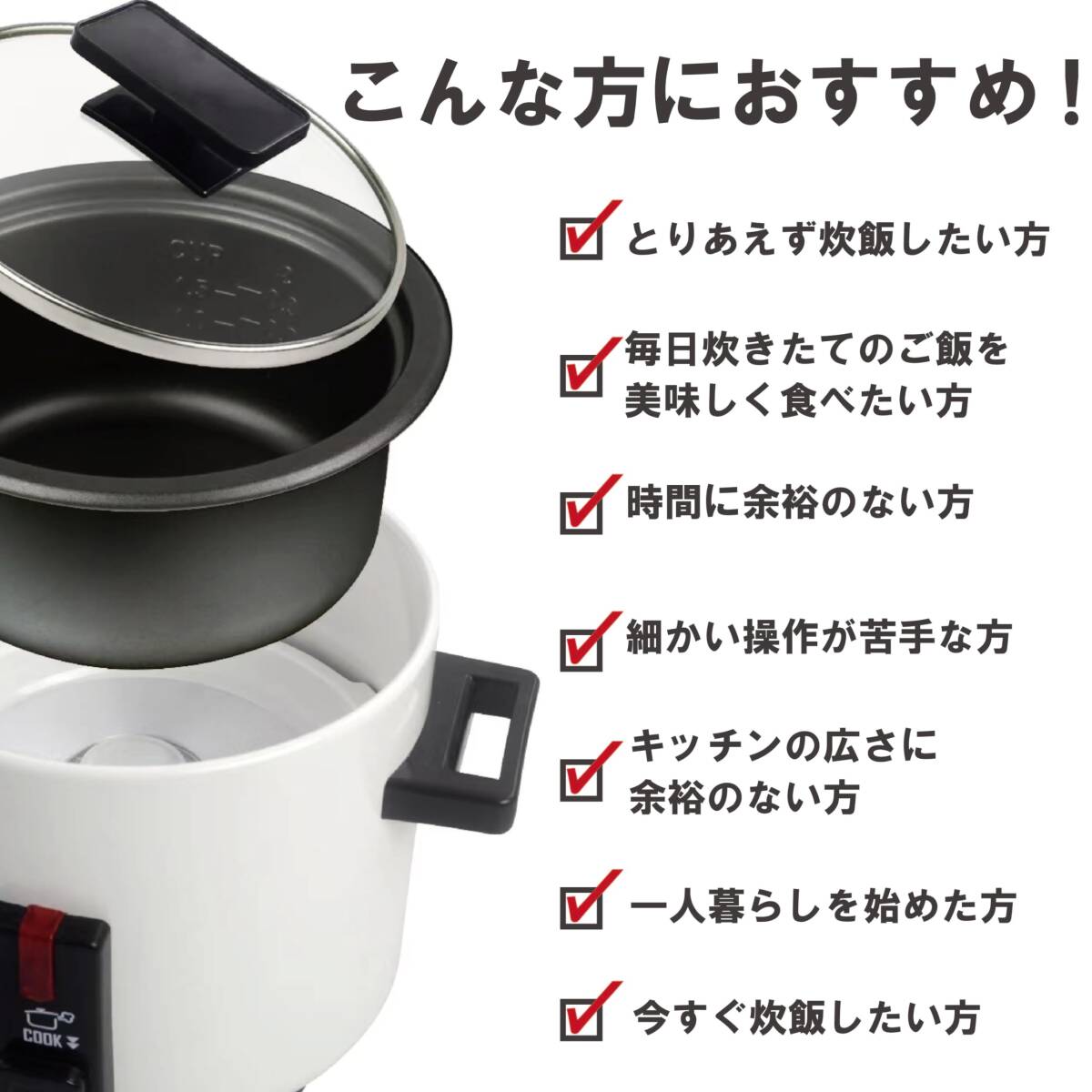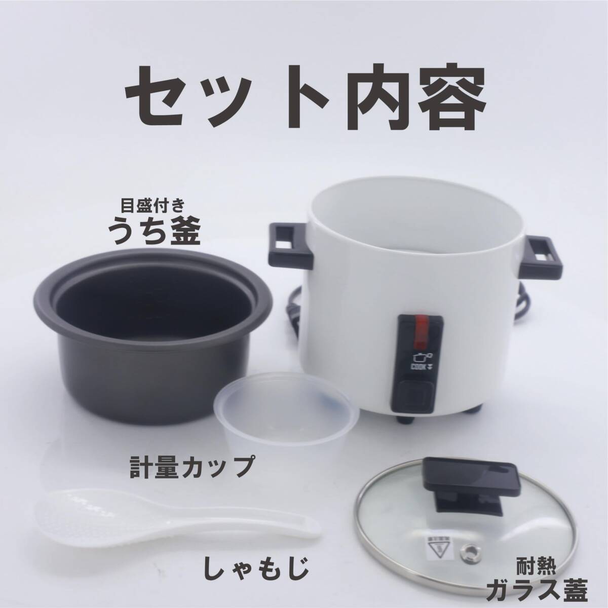 ●1~2人分でも、ふっくらおいしい。忙しい朝食、遅い夕食にも。 ●スイッチ1つで操作が簡単。 ●仕様 ・電源:AC100V 50/60Hz共用 ・消費電力:200W ・炊飯容量:0.5~1.5合 ・本体サイズ:約200(W)×168(D)×171(H)mm ・質量:約0.97kg ・付属品:計量カップ、しゃもじ