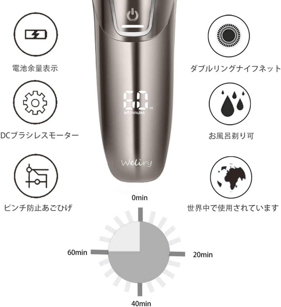 充電については、1.5時間の急速充電で最大60分間使用可能です。バッテリー完全充電時にはデジタル画面に60と表示。日常生活で3分間しか使用しない場合、約20日間の使用が可能です。USB充電ケーブルでコンセントやパソコンに接続できます。