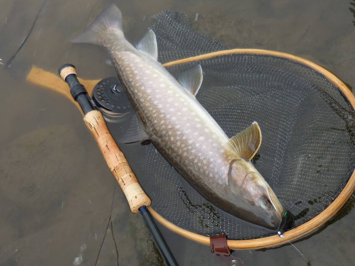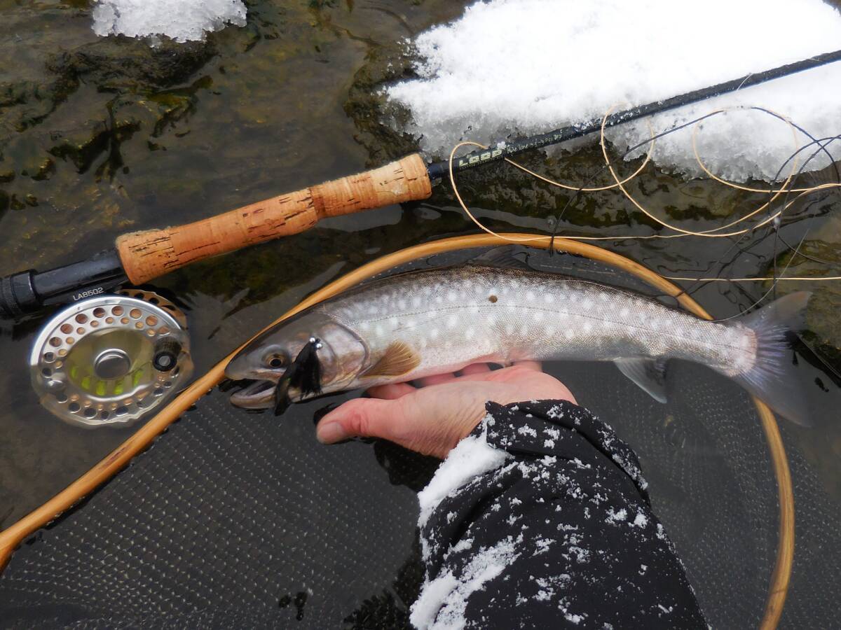 吹雪き模様のあいにくの天候でしたが、別なフライで釣果があり、こちらも試してみることに。最初に40cmクラスのアメマスが掛かり、その後にズシリとしたアタリで掛かったのは冬でもコンディションの良い54cmのアメマスでした。いずれもリトリーブでの釣果です。