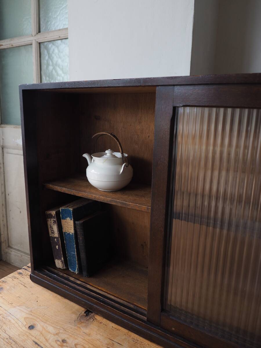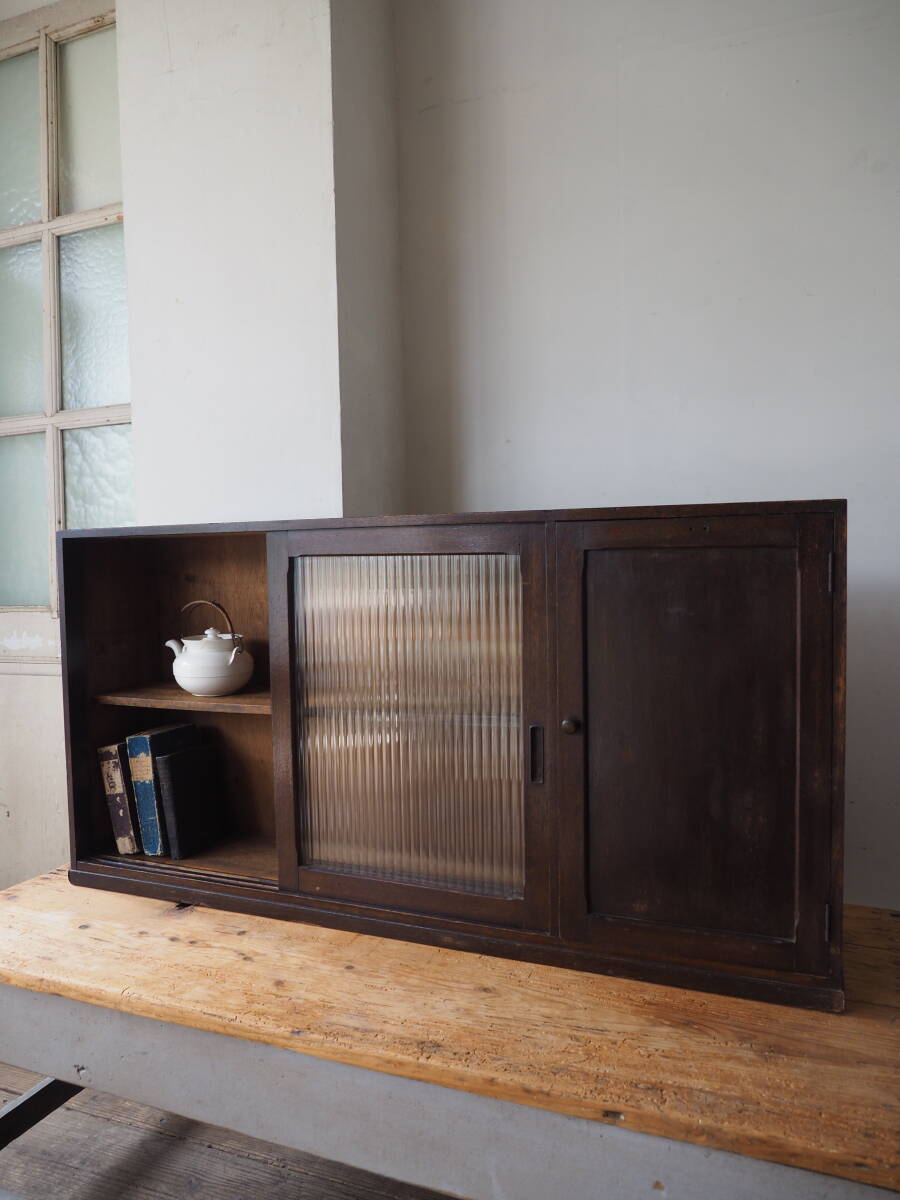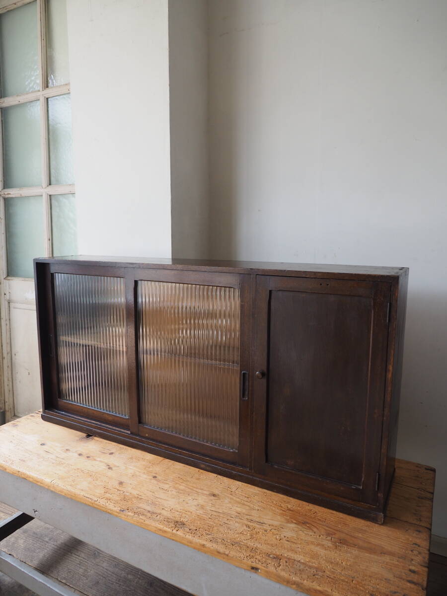 | ks-0857 薄型の戸棚 モールガラス引き戸 /検 アンティーク ヴィンテージ 収納 ガラス棚 レトロ |