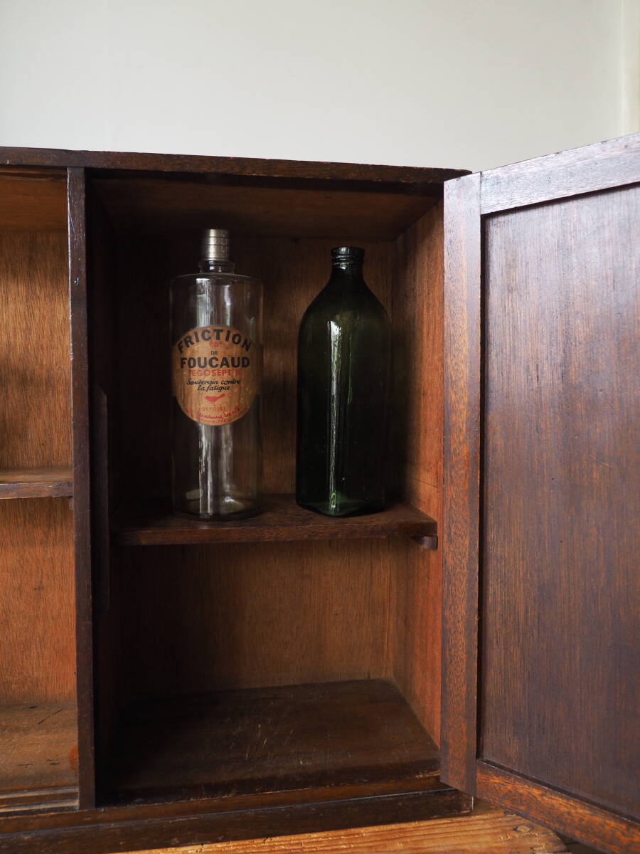![]() ![]() ![]() ![]() ![]() 味わい深い表情をみせる、日本の古い戸棚。 ガラス引き戸と木の開き戸が付いた、奥行がコンパクトな薄型の作り。 特注で作られたものでしょうか、とても珍しい作りの一品です。 ノスタルジックなモールガラスは、中に収納したものの適度な目隠しに。 引き戸を外してオープンシェルフの様な使い方も可能です。 床置き、卓上とどちらでも使用出来そうなサイズ感。 棚板2枚は取り外しも可能なので、ボトルやフラワーベースなど高さのある物も収まります。 ショップ什器や小さなコレクションの飾り棚、和の空間のしつらえに。 シーンに合わせて幅広く使えそうな可愛らしい家具です。 Size:幅106.5、奥行21、高53.5(約・cm) 引き戸棚内部:幅73、奥行15、高さ上24、下23(約・cm) 開き扉内部:幅29、奥行上15、下17、高さ上28、下19(約・cm) Material:木、ガラス Country :日本 Condition:古い物です。 全体的に小キズ・擦れ・汚れ・凹み・表面の傷み・スキや小穴・シミなど経年による使用感がございます。 丁寧にクリーニング済みです。 ★この他にも多数出品中です。こちらより是非ご覧ください★ |