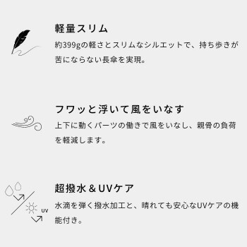 | 商品名の「エアリー」とは、軽さと、強い風を受けた時に感じる「フワッ」と持ち上がるような動きから。「フワッ」の秘密はオリジナルの骨パーツ。衝撃に対して「く」の字型のパーツが上下に動き、風をいなして親骨の負荷を減らします。巻きやすさを追求して通常よりも太くしたバンドもポイント。 ■注意事項 ・製品には尖った部分があります。常に周囲の安全を確認してご使用ください。 ・手元または骨の先端が壊れたまま使用しないでください。 ・振り回したり投げたりしないでください。 ・豪雨強風時は破損する恐れがありますので使用しないでください。 ・基準を超えた雨量によっては雨漏りする場合があります。 ・傘骨の構造部に手を触れないでください。 ・傘生地は色落ちする場合もありますので乾燥が充分でない傘を服その他の物に接触させないでください。 ・自転車運転中は使用しないでください。 ・お子さまの使用時は保護者の方がご注意ください。 ・沖縄、離島は別途追加送料が必要になる場合がございます。 ・製品の色調は、お客様のご使用のモニターやブラウザ等の環境により、実物と異なる場合がございます。 |