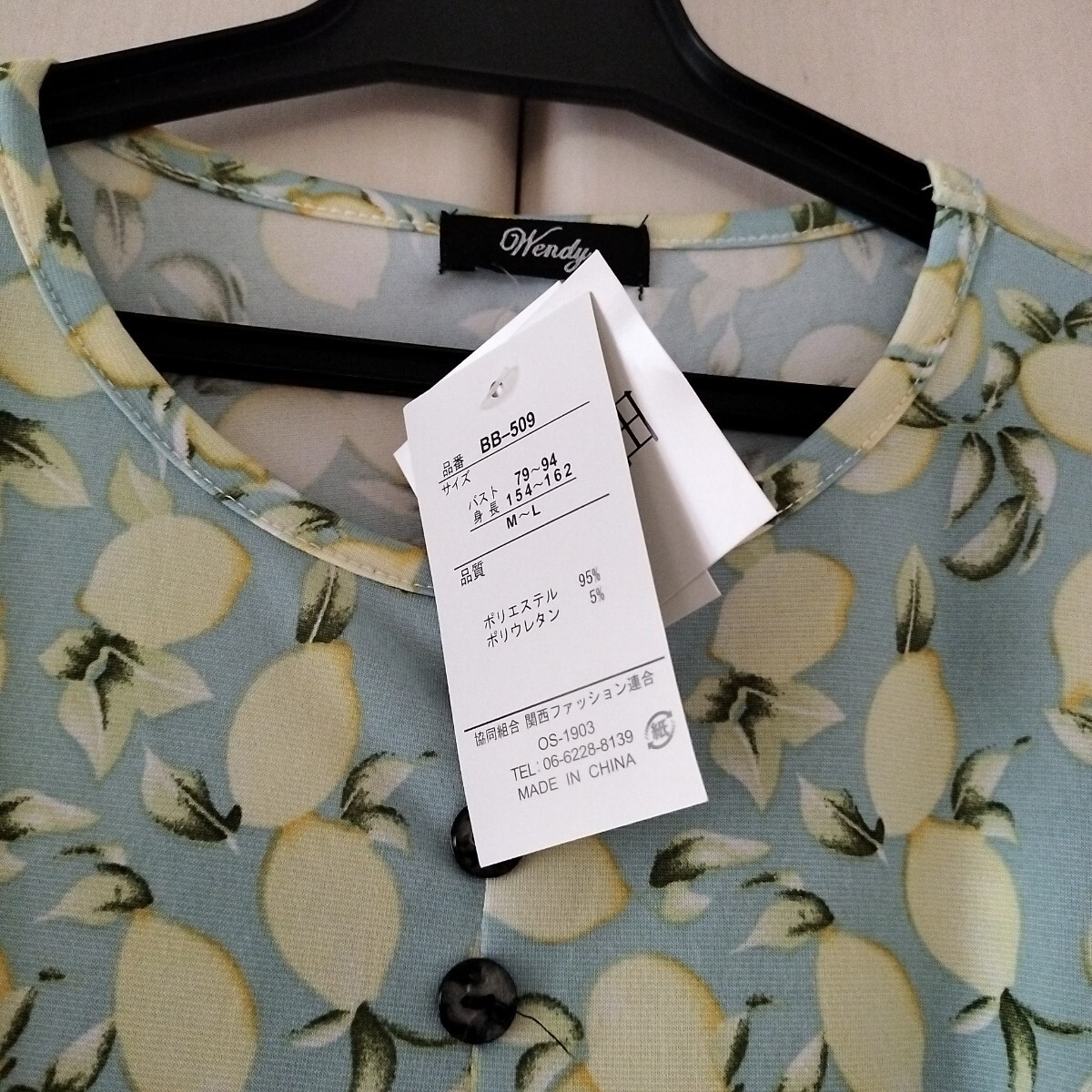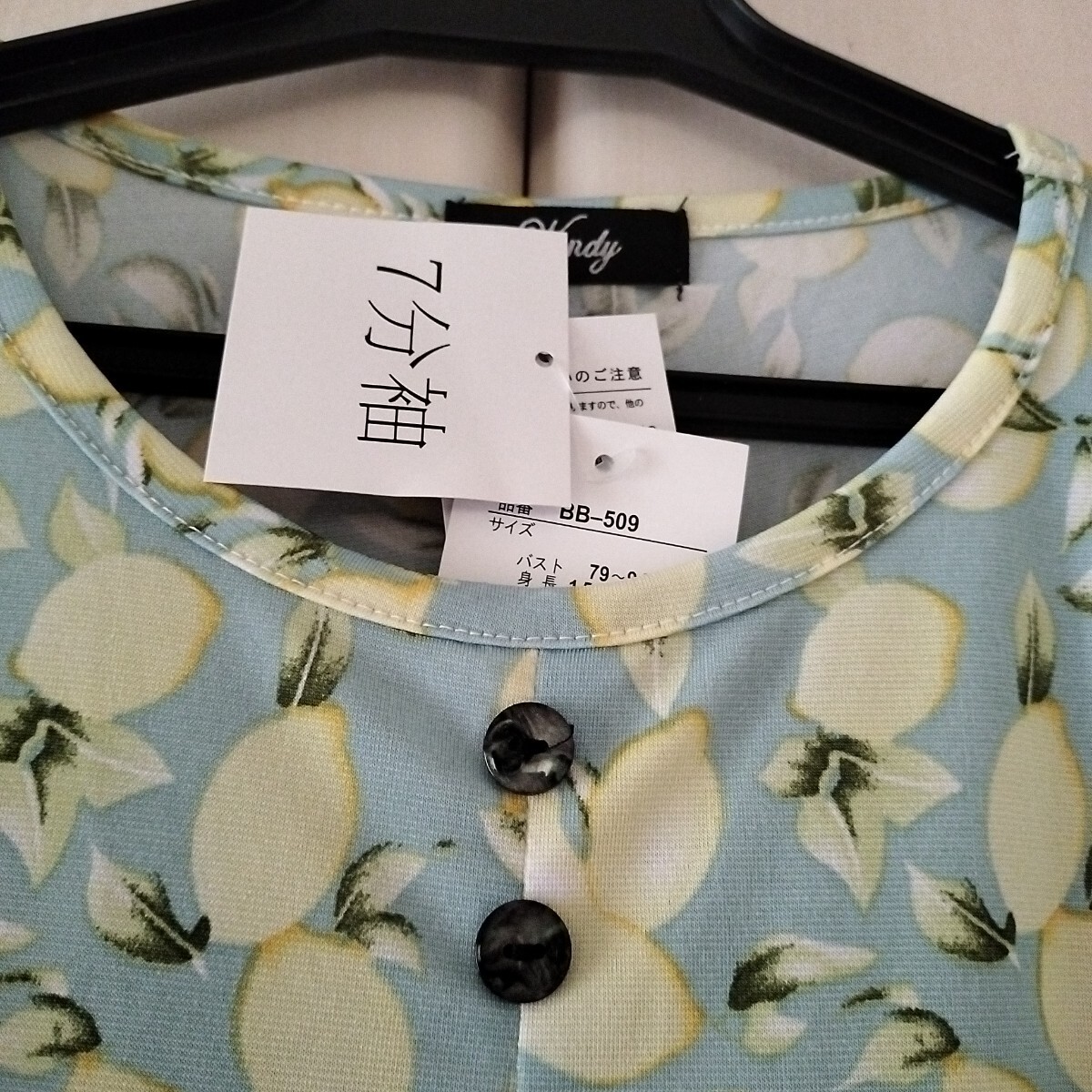 【M~Lサイズ】新品 Wendy 七分袖 チュニック カットソー 関西ファッション連合 レディース トップス ミセス 飾りボタン B509 水色 レモン