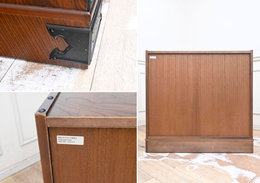 ----------------------------------------------------------------------------------------- ●送料や注意事項は必ずご確認下さい。落札後にトラブルになるケースが増えております。● ◆コンディションは写真・文章にて記載して有りますが、全てのキズの写真は掲載致しておりません。大きなダメージを除き見落とし、記載漏れが有る事はご了承下さい。 ◆当サイトにて出品する商品は多種多彩で、当方商品知識の無い物も多数ありますので落札後の質問やメンテナンス等にはお答えできません。 ◆入札された時点で、画像、文章をご理解していただいたものと判断させていただきます。不明な点は前もってQ&Aからお願い致します。入札後の質問やお電話等でのキャンセルは一切受け付け致しません。 ◆商品説明に「ノークレーム」と記載しているものに関しては、如何なる状況で届いても保証致しません。詳しくは注意事項の「商品到着後について」の最後に記載しておりますのでご確認下さい。 ---------------------------------------------------------------------------------------- 美しい木目に曲線で作られた前面は見る者を魅了するでしょう。 造りに関しても引出しはからくり式でカギがかけられるようになっています。 蓋の中の引出を開ける時は、蓋の下の引出を開くと蓋内の引出が開きます。 幅90 奥45 高85cm 【コンディション】 金具錆?クスミ、引出表面ダコン、その他小キズ、ダコン、汚れ等有りますが、あまり使っていなかったのか?超美品と言える奇麗なお品です。 | ||