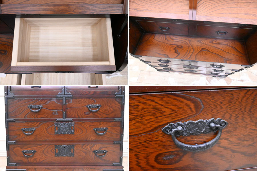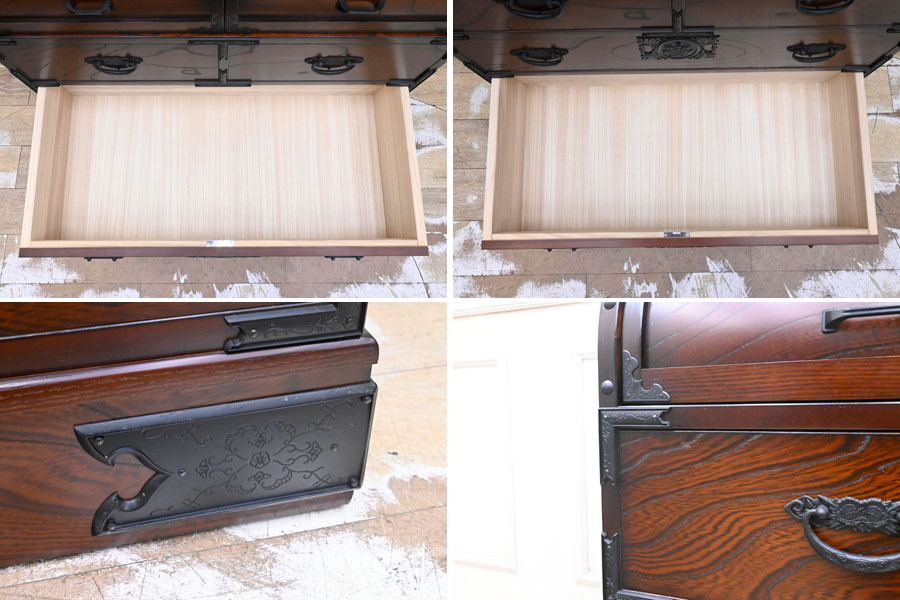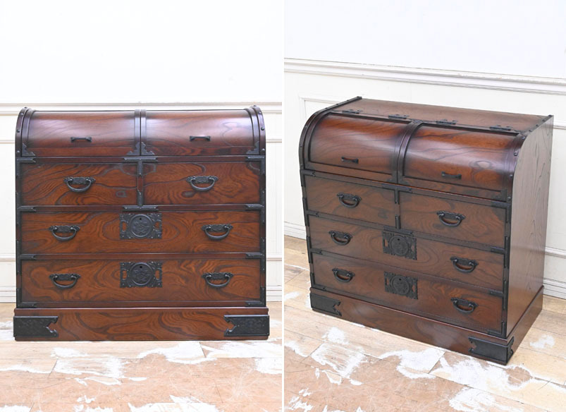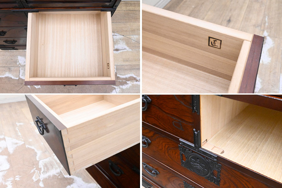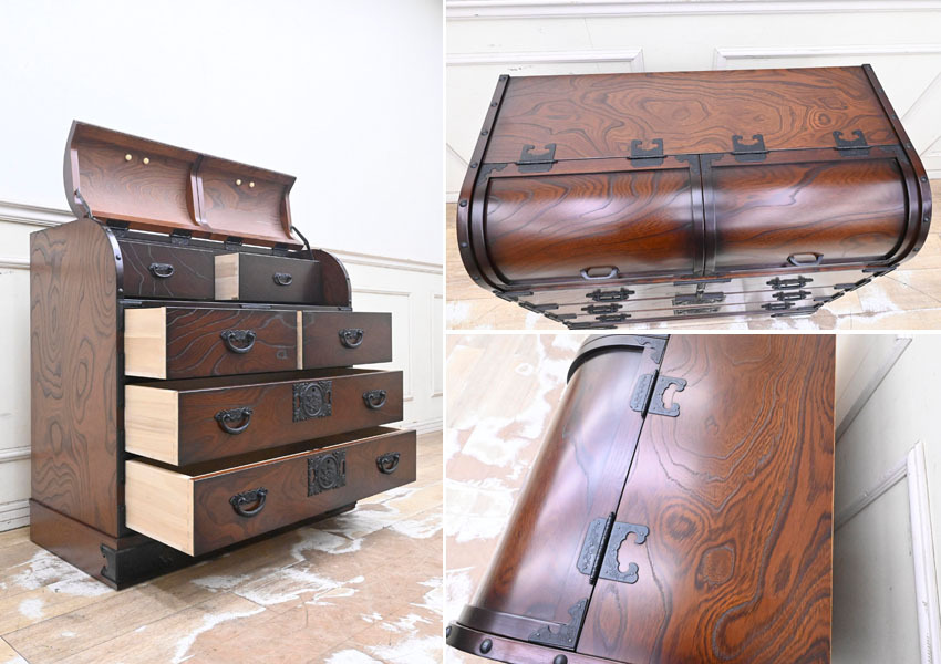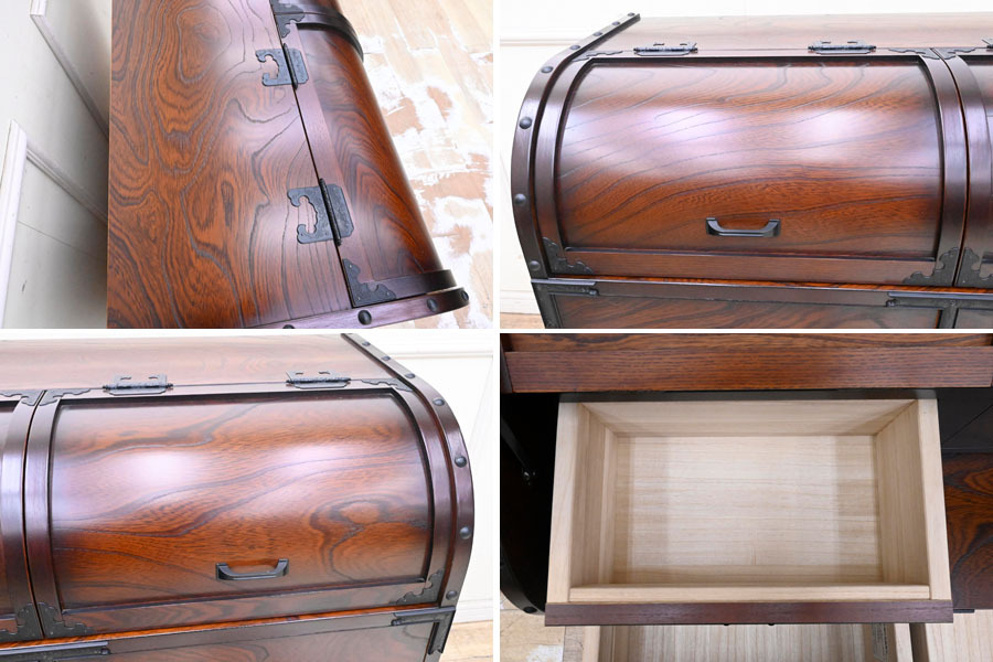 ----------------------------------------------------------------------------------------- ●送料や注意事項は必ずご確認下さい。落札後にトラブルになるケースが増えております。● ◆コンディションは写真・文章にて記載して有りますが、全てのキズの写真は掲載致しておりません。大きなダメージを除き見落とし、記載漏れが有る事はご了承下さい。 ◆当サイトにて出品する商品は多種多彩で、当方商品知識の無い物も多数ありますので落札後の質問やメンテナンス等にはお答えできません。 ◆入札された時点で、画像、文章をご理解していただいたものと判断させていただきます。不明な点は前もってQ&Aからお願い致します。入札後の質問やお電話等でのキャンセルは一切受け付け致しません。 ◆商品説明に「ノークレーム」と記載しているものに関しては、如何なる状況で届いても保証致しません。詳しくは注意事項の「商品到着後について」の最後に記載しておりますのでご確認下さい。 ---------------------------------------------------------------------------------------- 美しい木目に曲線で作られた前面は見る者を魅了するでしょう。 造りに関しても引出しはからくり式でカギがかけられるようになっています。 蓋の中の引出を開ける時は、蓋の下の引出を開くと蓋内の引出が開きます。 幅90 奥45 高85cm 【コンディション】 金具錆?クスミ、引出表面ダコン、その他小キズ、ダコン、汚れ等有りますが、あまり使っていなかったのか?超美品と言える奇麗なお品です。 | ||