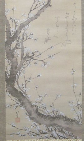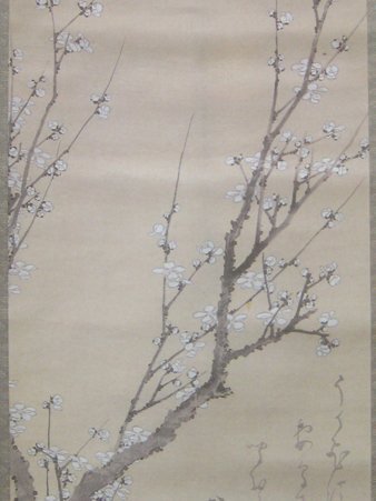★掛軸 葛飾北斎 絹本 白梅図/工芸印刷 共箱
