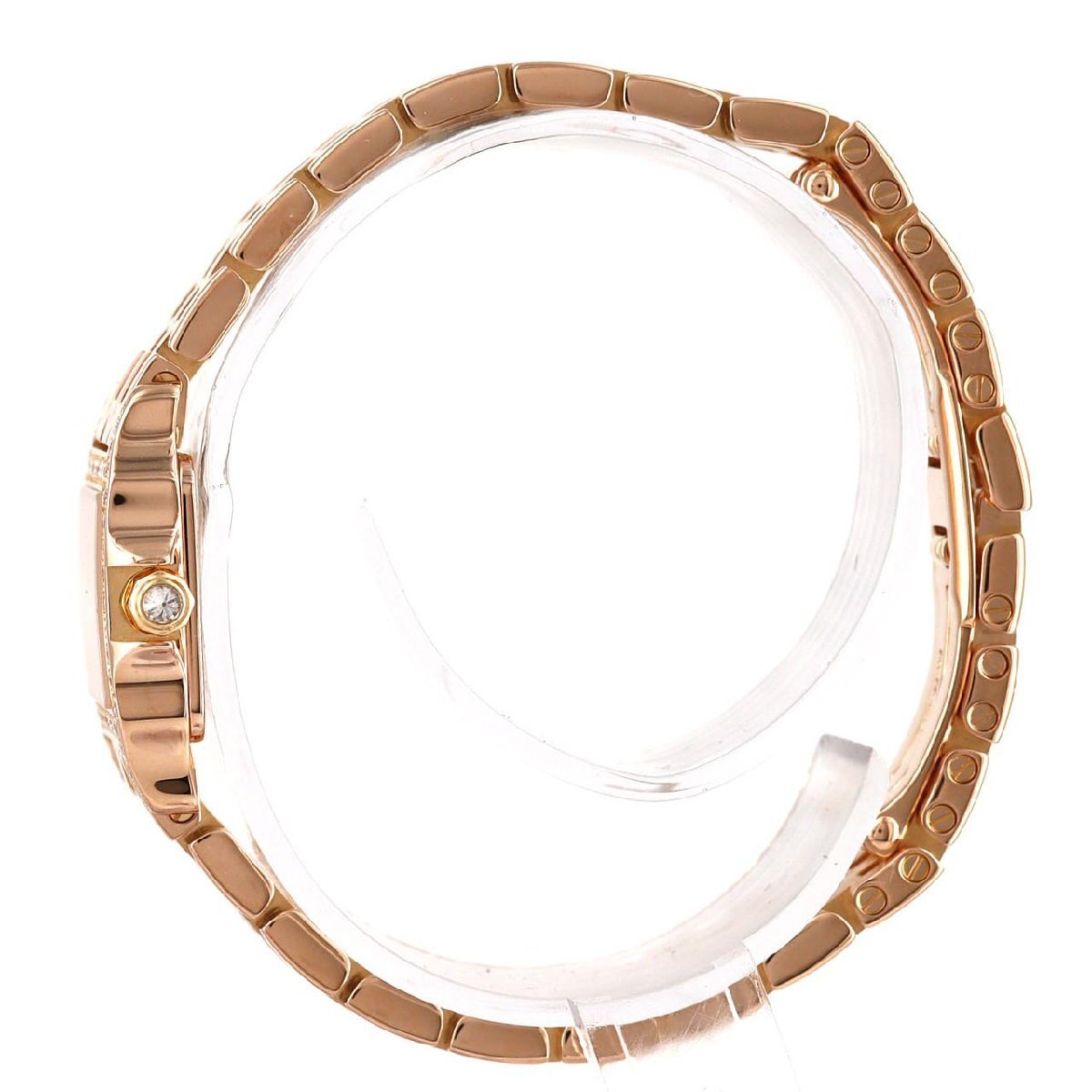 2005年に登場したサントスドゥモワゼルは、1904年に創作した人気シリーズ「サントス」の女性用モデルです。飛行士のパイオニア、サントス・デュモンの飛行機「ドゥモワゼル号」に由来しています。その中でもこちらは、ピンクゴールドの素材を使用し、ベゼルにはダイヤモンドがあしらわれたゴージャスなモデルです。現在の時計業界では「ミニサイズ」と呼ばれる小ぶりな時計は少ないので、小ぶりな時計をお探しの型にはおすすめです。