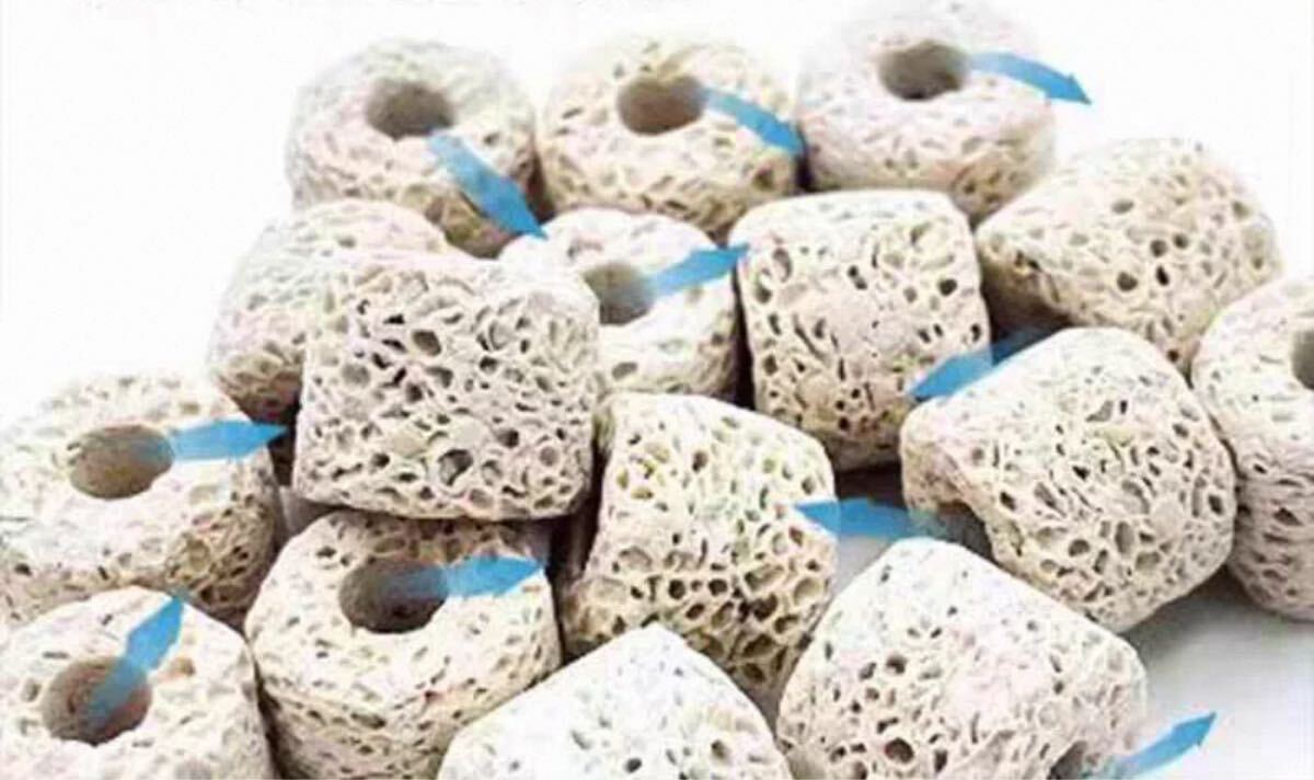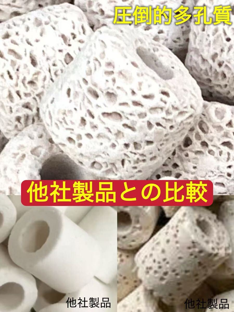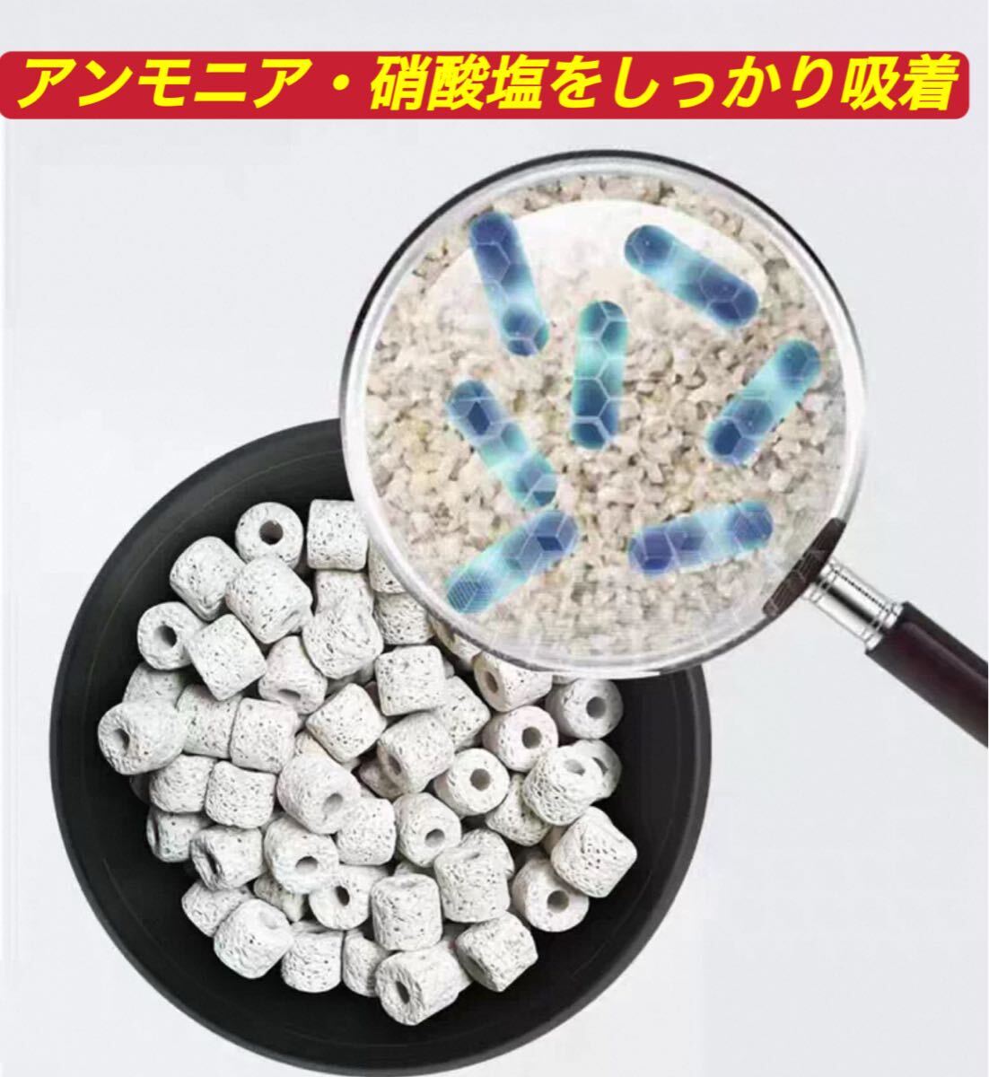 表面の窪み、内部の多孔質空間により、ろ過バクテリアが多く定着できます。魚のフンや食べ残した餌から発生するアンモニアを硝化バクテリアがしっかり分解し、分解時に発生する亜硝酸塩も低毒な硝酸塩へ分解するなど、有害物質を除去し、安心安全の生物ろ過方式による、水質の安定化・魚にとっての健康的な環境作りに役立ちます。