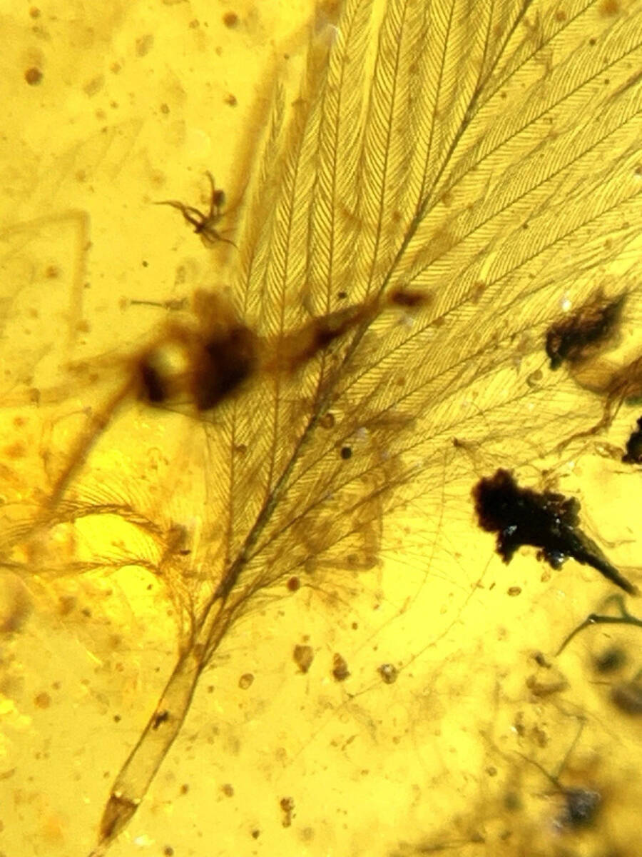 この標本は、ほとんど不純物も含まれておらず、「何が含まれていますか?」と聞かれてたら「羽毛」としか答えようがないお手本のような標本です。
