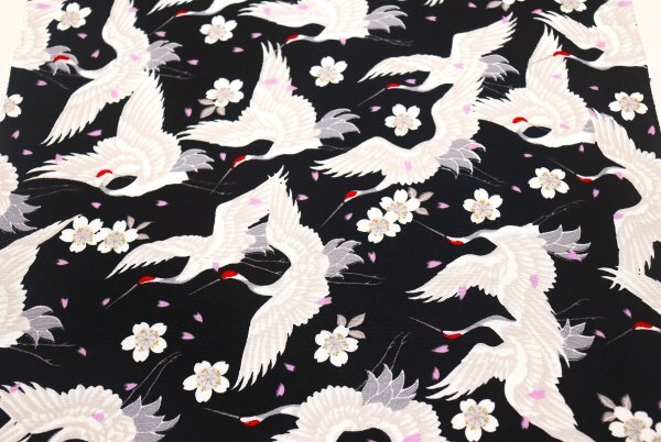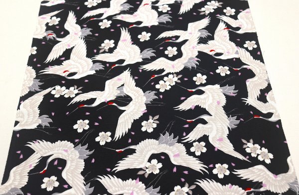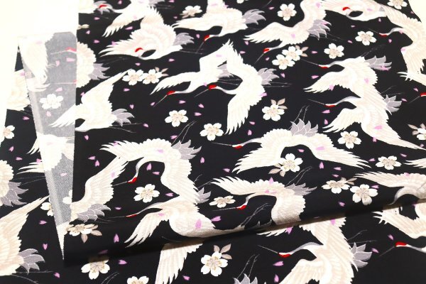 | 【京わぎれ】正絹 友禅染はぎれ 鶴に桜 黒地 変わり無地生地 (しぼ低め) 2.9m ③ | ||||