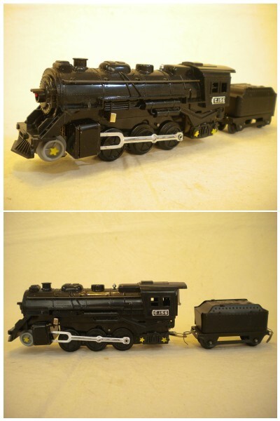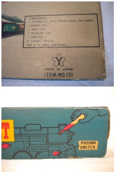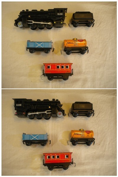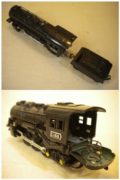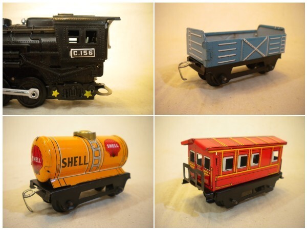 *プラスチック製の蒸気機関車、ブリキ製の4両の貨車とも、小傷、擦れ等はほとんどなく、また光沢もあり、未使用のように綺麗です。