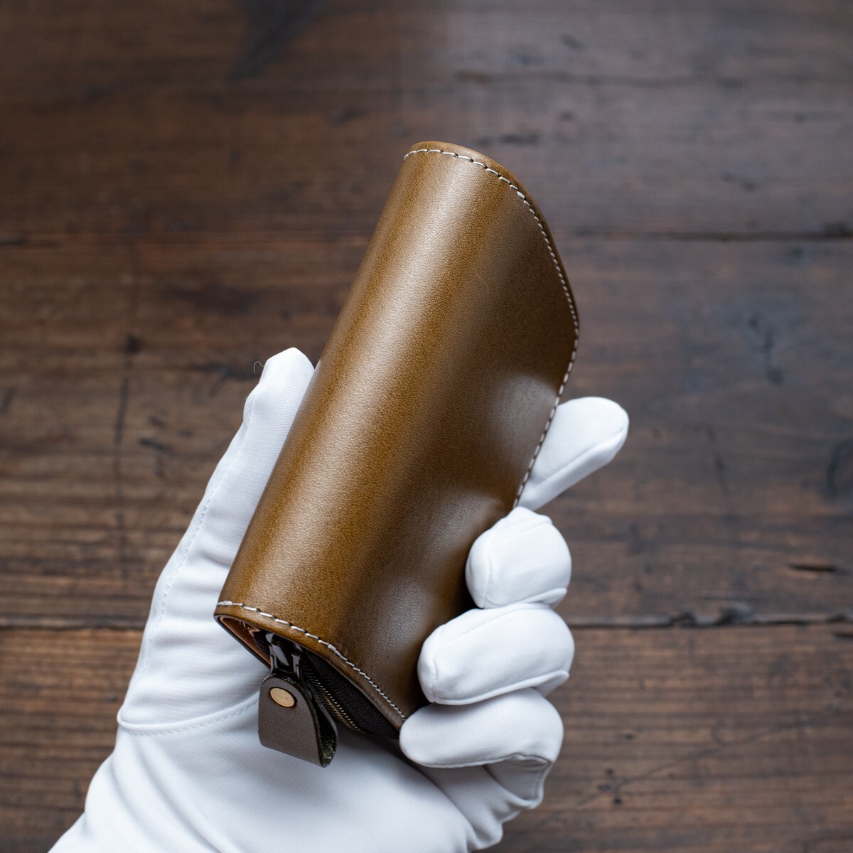 素材にはイタリアンレザーを使っており、自然な光沢感のある表面にはほどよいハリがあります。手に取ったときのスベスベとした感触と、使うほどに深まる艶が特徴です。革の繊維が密に詰まっているため、しっかりとしたコシがあり、型崩れしにくいのも魅力です。