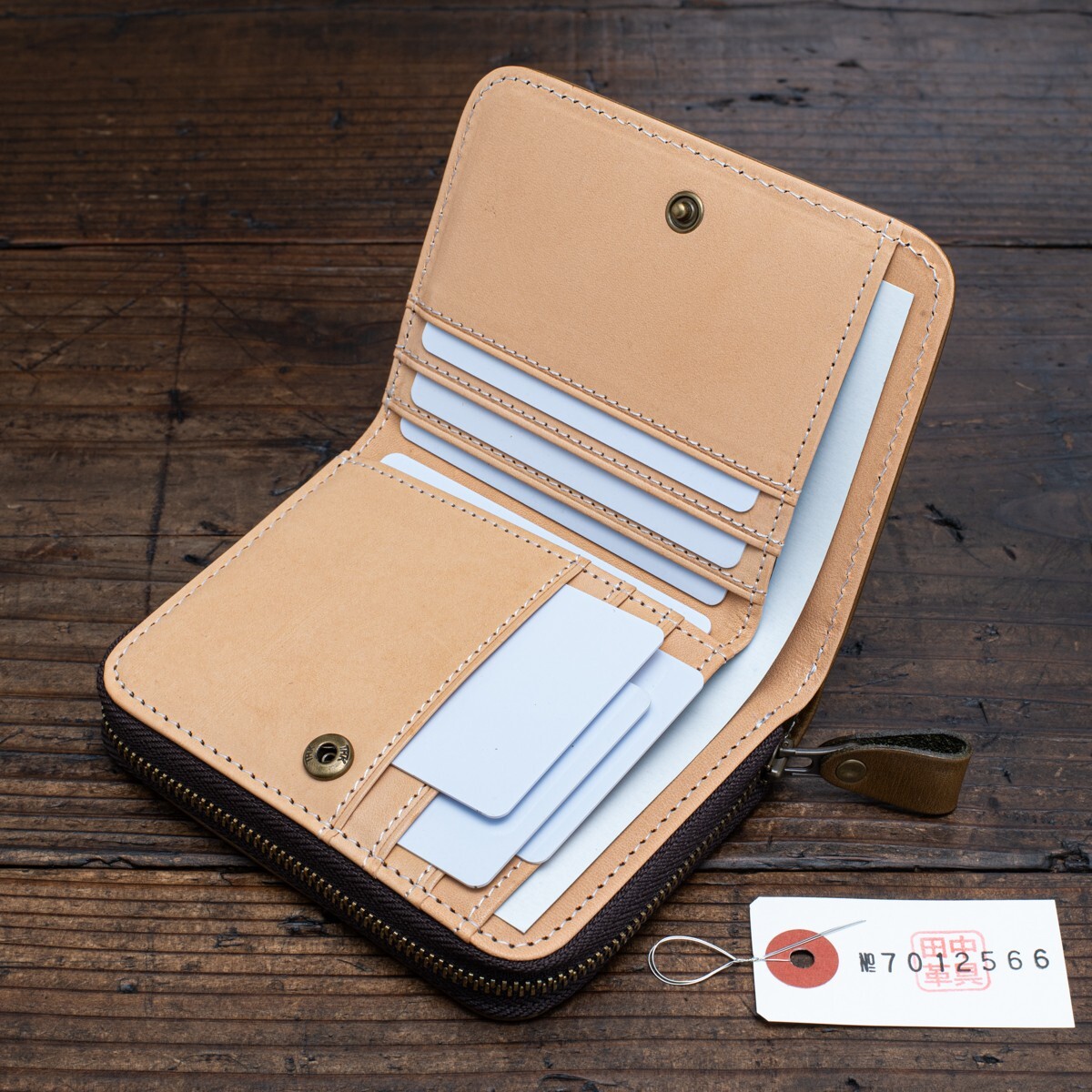 オリーブグリーンのイタリアンレザーで仕立てた、手のひらに収まるサイズ感のコンパクトウォレットです。ラウンドファスナーとスナップボタンをそれぞれ独立して使える構造で、紙幣・小銭・カードをすっきりと仕分けられます。