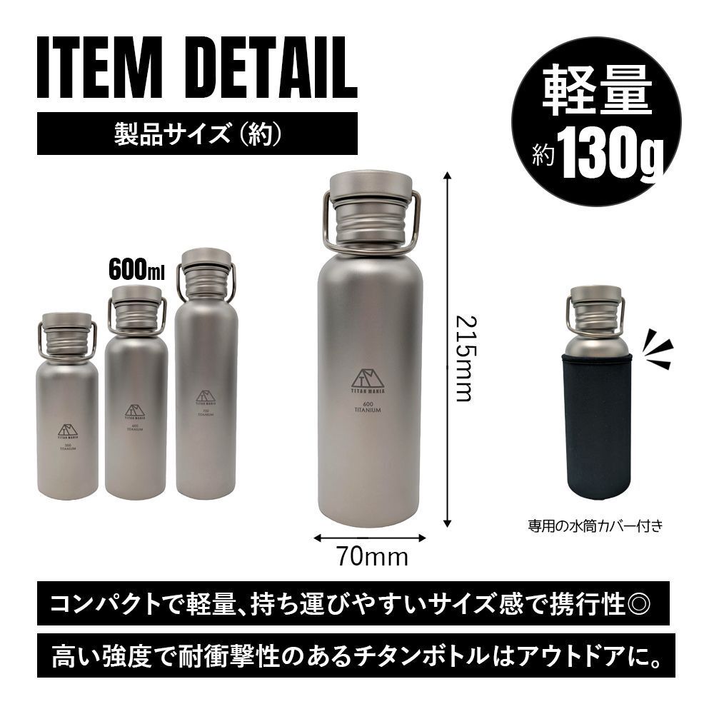 直火可能!軽量で頑丈、サビに強いチタン製ボトル(水筒)。飲み物や氷などを入れやすい広口タイプ。チタン水筒は高温に強く直火にかけても変形しにくい。ボトルハンガーで吊り下げることができるので簡単に湯沸かしができる。直火で使うことができるキャンプギアは荷物を少なくしたいソロキャンプや登山などウルトラライト(UL)キャンプにおすすめ。