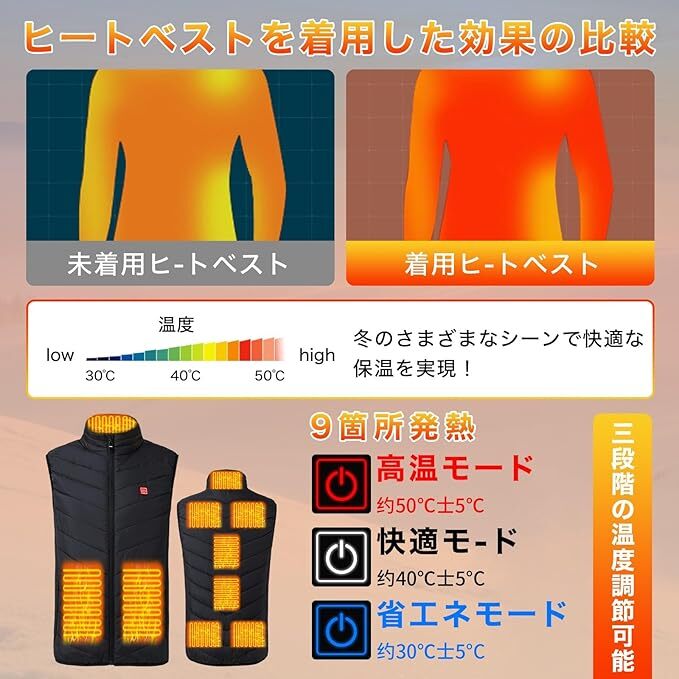 電熱ベスト 温熱ベスト Lサイズ 20000mahバッテリー 日本製ヒーター内蔵 前後9箇所発熱 3段階温度調整 USB給電 洗濯可 男女兼用 節電