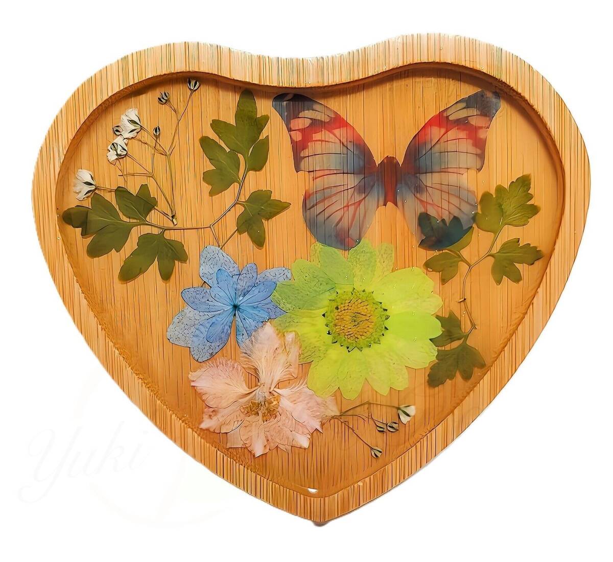 押し花(ノースポール、紫陽花、千鳥草)蝶(シフォン)で可愛らしく仕上げました、お花のある暮らしを身近にお楽しみいただけます。