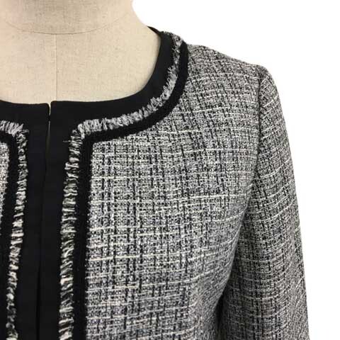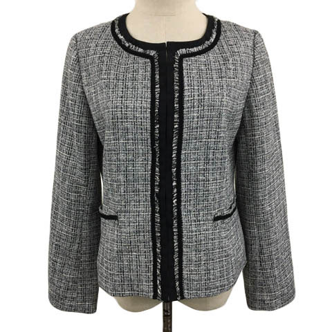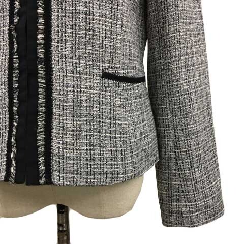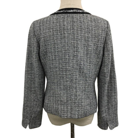アー・ヴェ・ヴェ ミッシェルクラン ジャケット ノーカラー シングル ツイード調 ラメ フリンジ 総柄 ナイロン長袖 L グレー 黒 ブラック