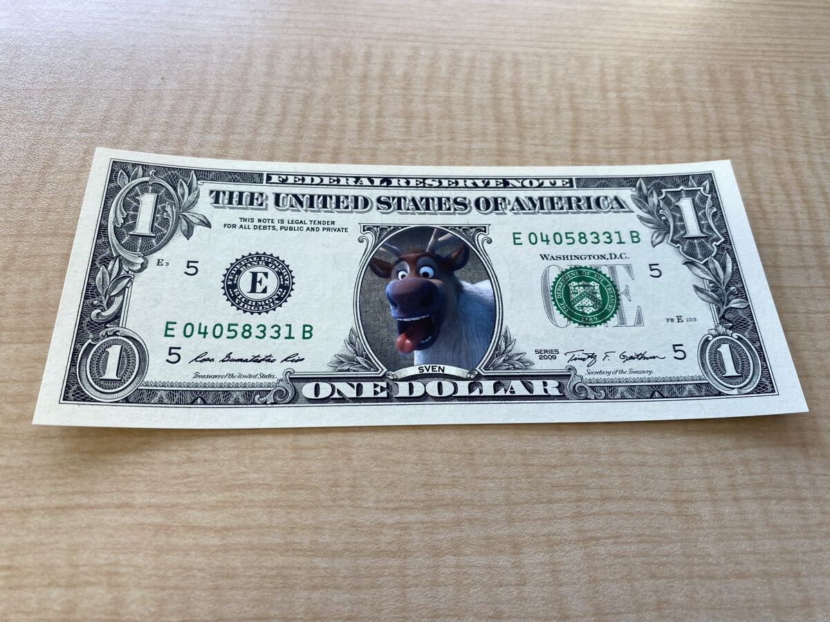 米ドルに肖像印刷されたキュラクターが貼られております。