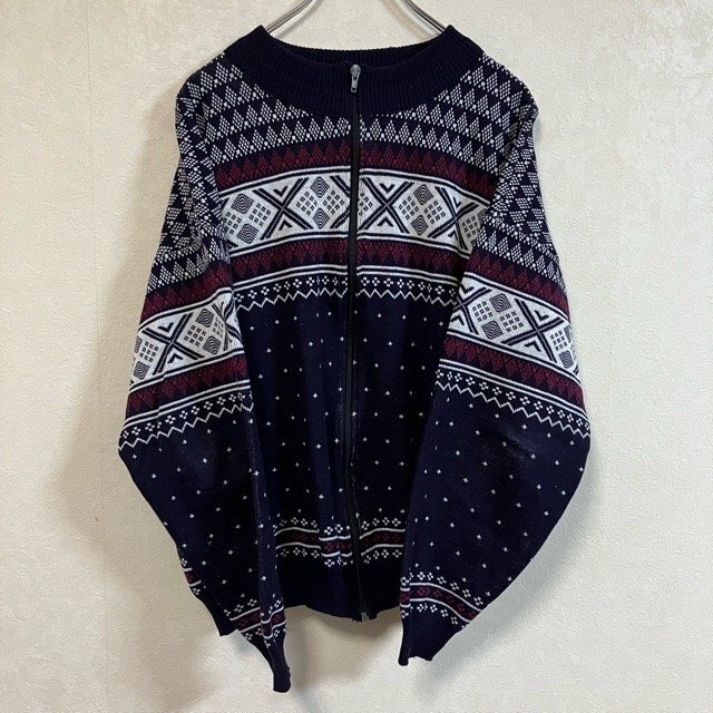 A1  56/58 ユーロ古着 総柄 ウール混 長袖 ジップニット ネイビー メンズ