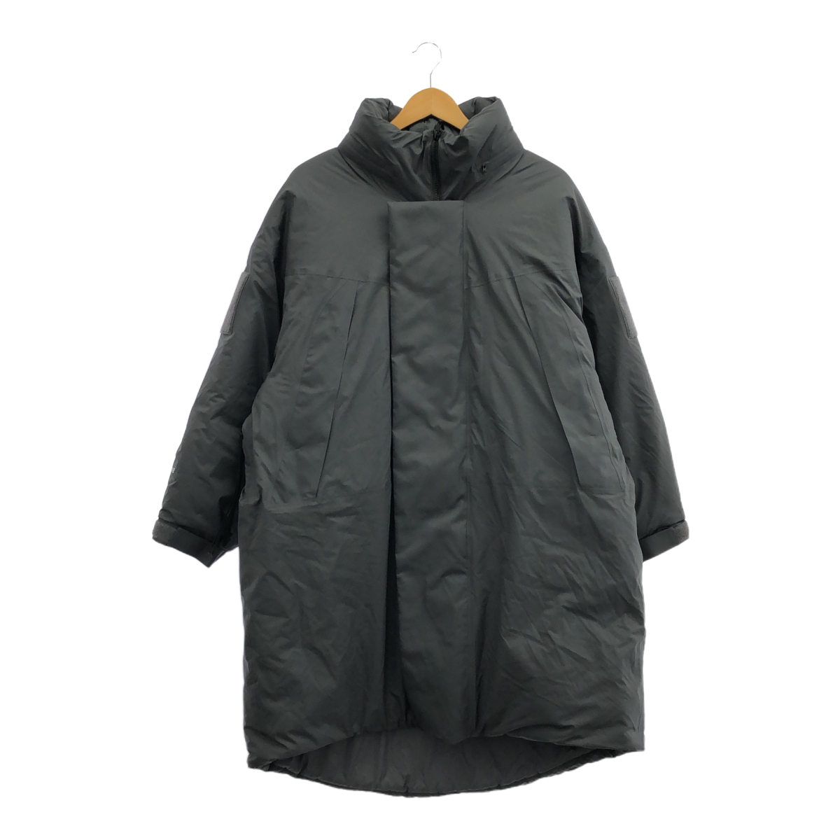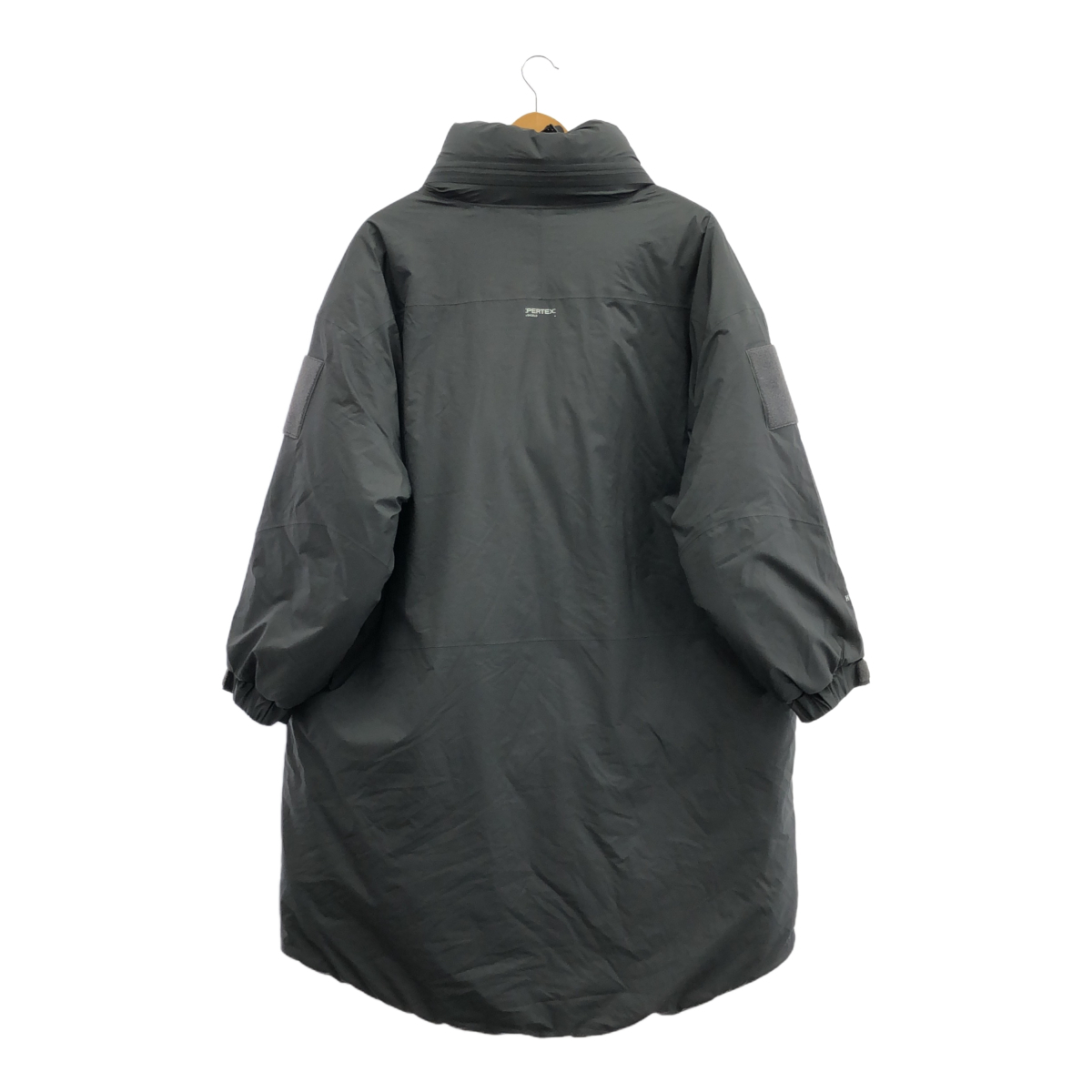 | STAFF COMMENT | HYKEのPERTEX PUFF PARKAです。ミリタリーウェア「PCU LEVEL 7 TYPE2(通称 MONSTER PARKA)」から着想を得た、オーバーサイズシルエットが特徴的な一着。ダークグレーの色合いが都会的な印象を与えます。表地には耐久性と防風性に優れたPERTEX SHIELD、裏地にはPERTEX QUANTUMを使用し、快適な着心地を実現。中綿にはPLIMALOFTを採用し、軽量ながらも高い保温性を誇ります。裾のドローコードでシルエットの変化も楽しめます。普段使いはもちろん、アウトドアシーンにもおすすめです。状態はBランクで、多少の使用感が見られます。 |