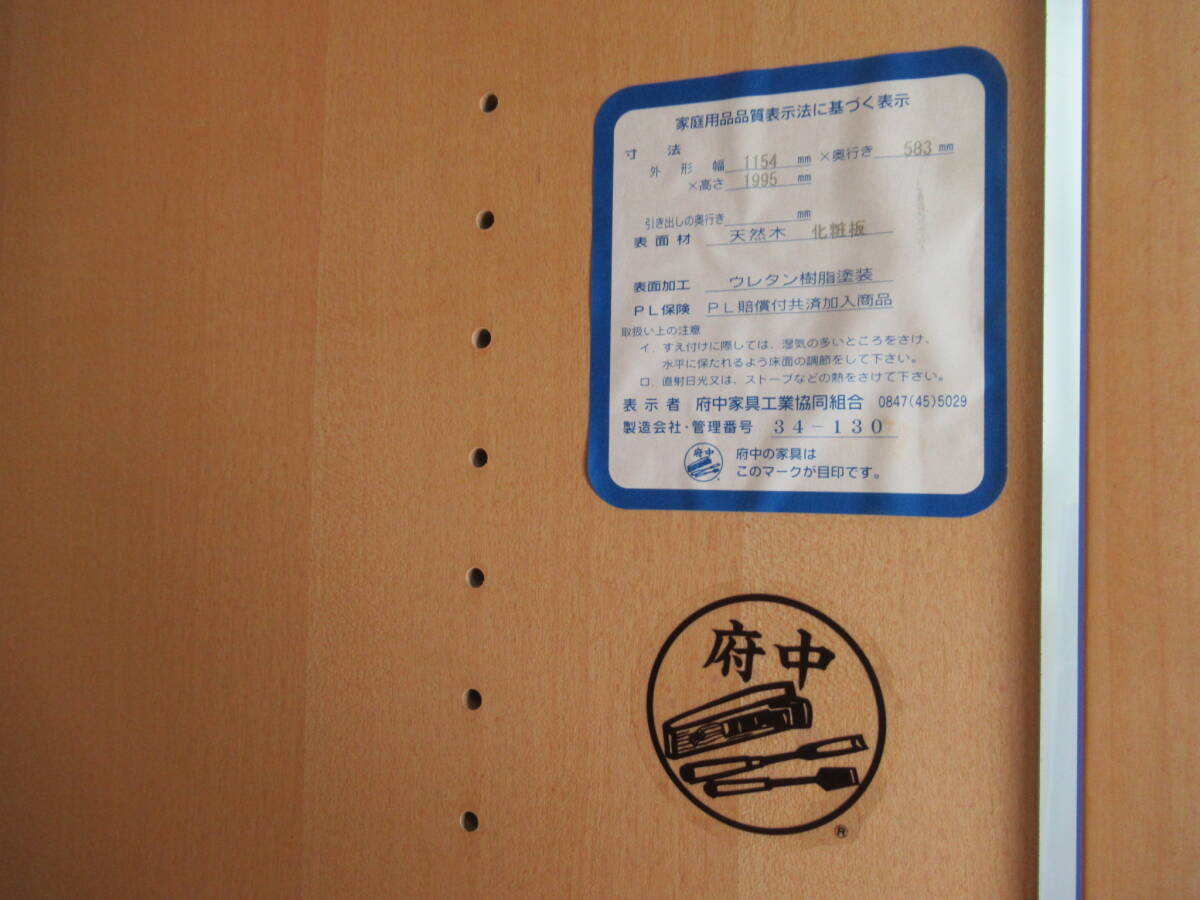 府中家具 ワードロープ 洋服ダンス 外形寸法:(約)W1154×D583×H1995mm クリーニング済みです。 外装に、目立つ汚れ・大きな傷・欠損箇所はございません。 左側面に傷がございます。 取っ手にはクスミが見受かられます。(画像参照) USEDですので、通常使用によるスレ等はございます。 商品状態は、画像にてご判断ください。 画像は撮影時及びPC環境設定により、異なる場合がございます。予めご了承ください。 画像を多数掲載しておりますので、PCにてご確認・ご参照くださいますようお願い致します。 携帯電話・スマートフォンでは、ご覧いただけない場合がございます。 |