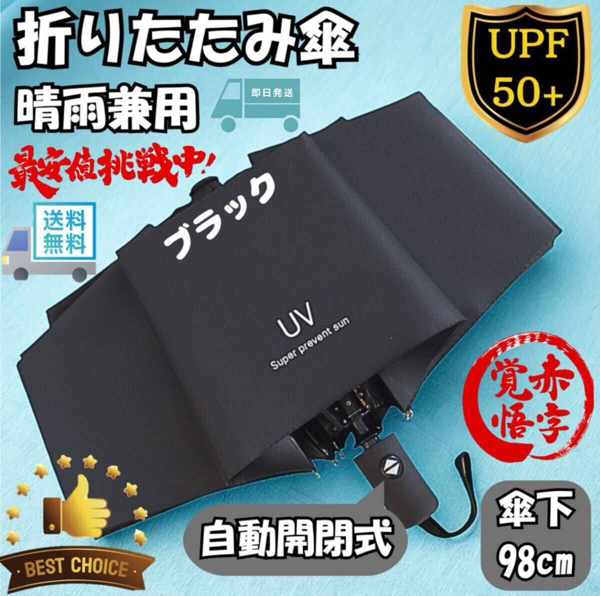 折りたたみ傘 ブラック 黒 晴雨兼用 UVカット UPF50+ ワンタッチ 自動開閉 遮光 遮熱 コーティング 直径98cm