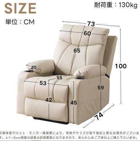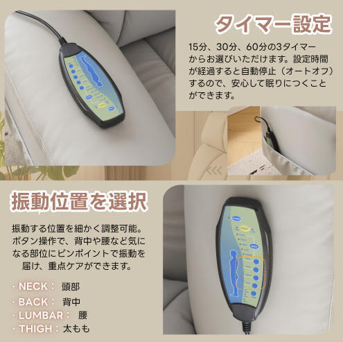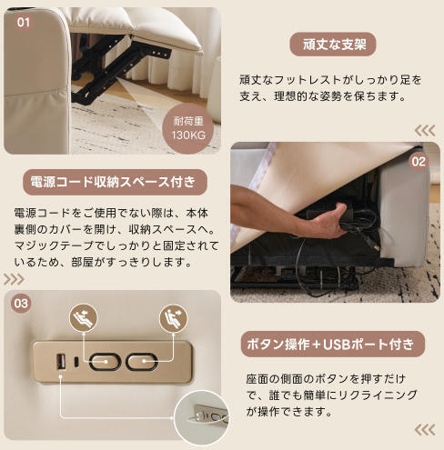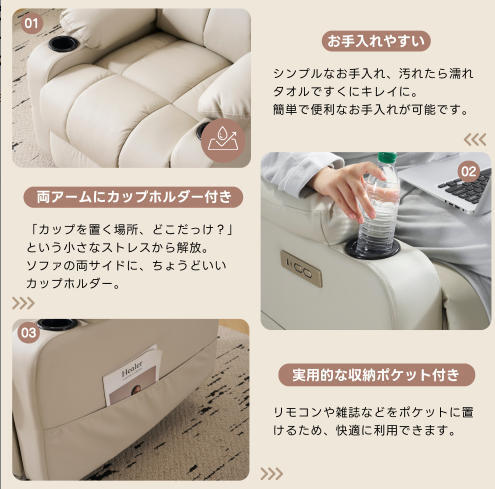 【快適な調整体験】前後で最大 165 度の調整が可能で、多様な座り方のニーズに応えられます。快適な半座り姿勢で映画鑑賞や読書をしたい場合でも、完全にリラックスした横たわりで休憩したい場合でも、簡単に実現でき、ユーザーに個人向けの快適な体験をもたらします。【座り心地よい】人間工学に基づいたデザインで、長時間の使用でも疲れにくく、リラックスした姿勢を保つことができます。ヘッドレストは、頭部をしっかりとサポートし、快適な姿勢をキープします。大きな背もたれは、背中全体に均等な圧力をかけ、腰や肩の疲れを軽減します。座面は、適度な弾力とフィット感を提供し、長時間座っていても疲れにくくなります。肘掛けは、手や腕を優しく支え、くつろぎのポジションをサポートします。【便利で思いやりのあるデザイン】側面に収納ポケットが設けられており、リモコン、雑誌、本といった小物の置き場に便利で、物が手元にありやすく、周囲の環境を整然と保ちます。USB インターフェースも備えており、スマートフォン、タブレットなどの電子機器の充電が便利で、機器のバッテリー切れを心配することなく、くつろぎの時間を満喫できます。【高品質な素材と工芸】外観から見て、ソファの表面素材は質感が良く、優れた人造皮革は触り心地が良く清掃も容易です。内部は柔らかくて支えがあるスポンジなどの素材で詰められており、座り心地が良く、長期間使用しても変形しにくく、精緻な製作工芸と相まって、ソファの耐久性と品質感が保証されています。【多機能な楽しみ】マッサージ機能と温熱機能を備えています。マッサージ機能は体の疲労を和らげ、血行を促進し、筋肉をリラックスさせるのに役立ちます。温熱機能は寒い日にユーザーに暖かさをもたらし、座り心地をより快適にし、まるで個人用のリラックスサービスを楽しんでいるような感覚を与えます。【外観と適合性】シンプルでおしゃれなデザインスタイルを採用し、ベージュ色の外観は優雅さとファッション性を際立たせています。また、黒色、グレー色といった定番の配色も選べ、現代的なミニマルスタイル、北欧スタイル、ラグジュアリースタイルといった様々なインテリアスタイルに簡単に適合し、室内の目玉となることができます。