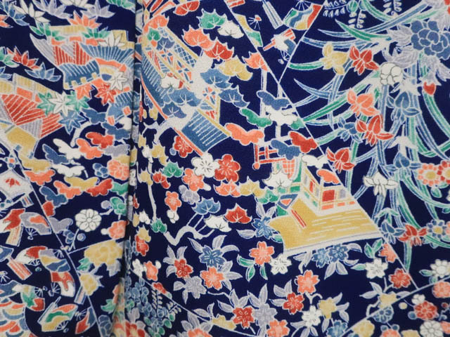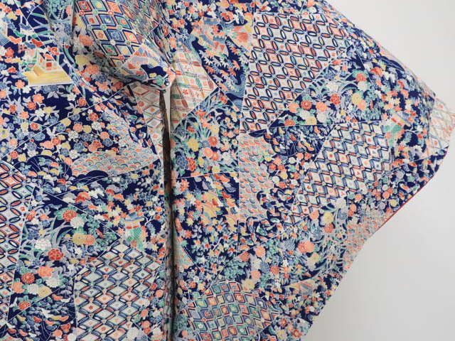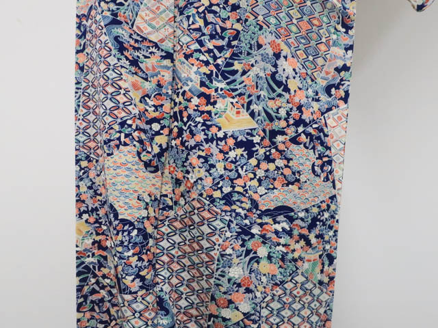 リサイクル商品のため、胴裏に薄しみがございますがご着用いただけると存じます。 地色は 紺です。 1枚目の画像が近いお色かと思われます。 素材は正絹です。 |