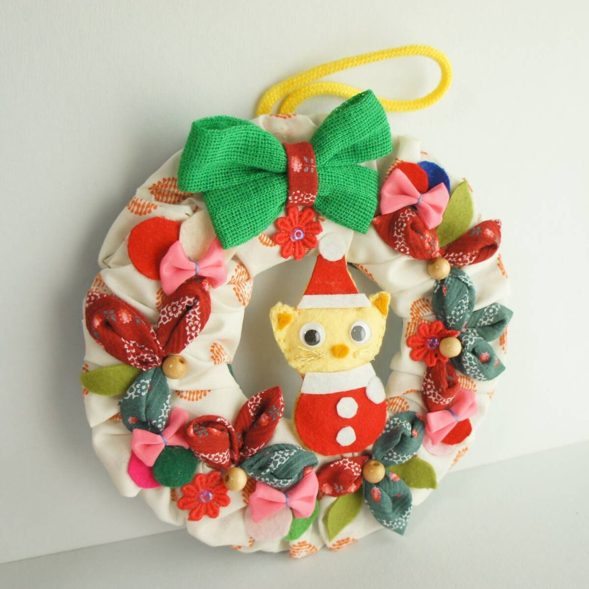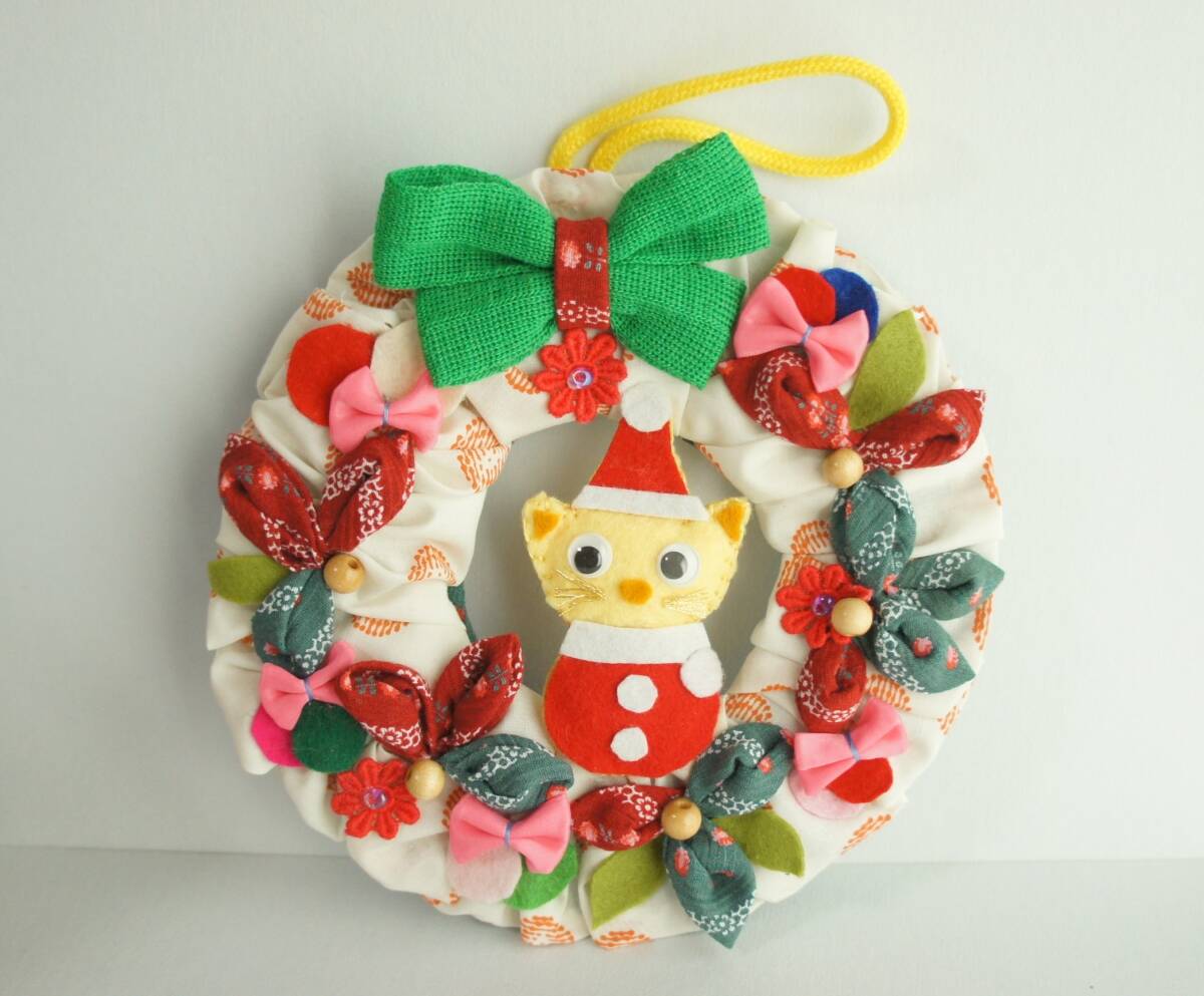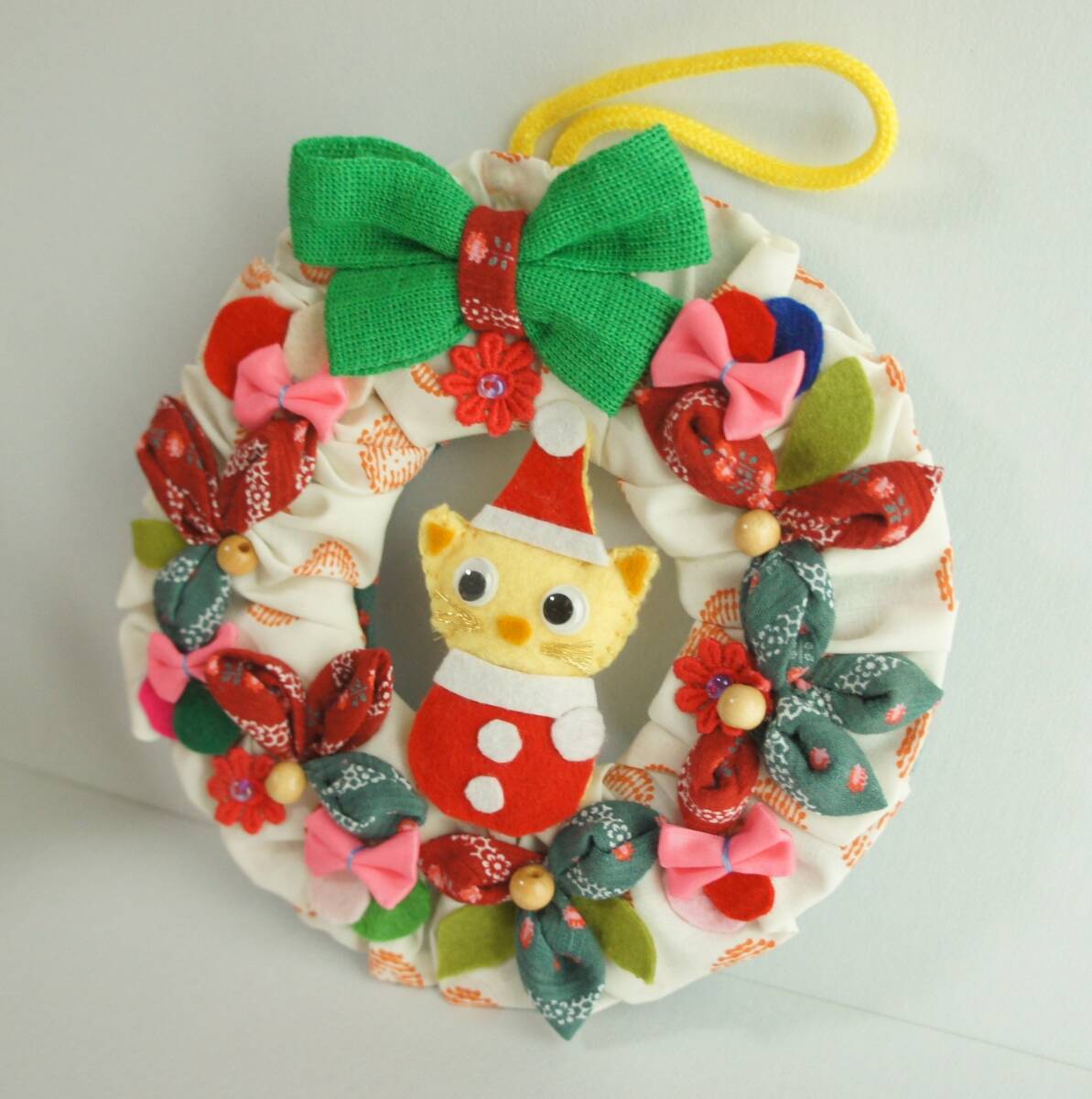 ハンドメイド クリスマスリース ねこ サンタクロース フェルト 動眼 つまみ細工