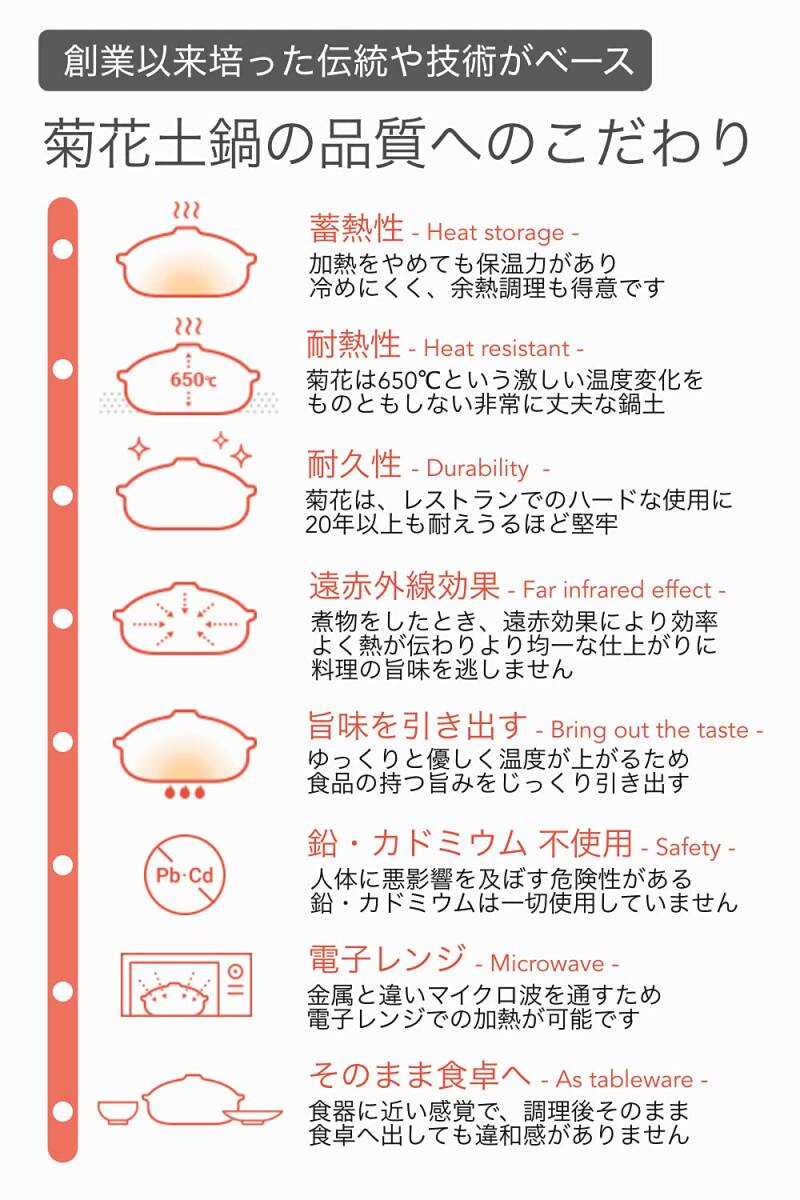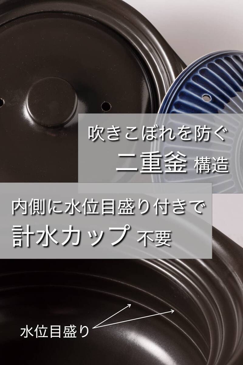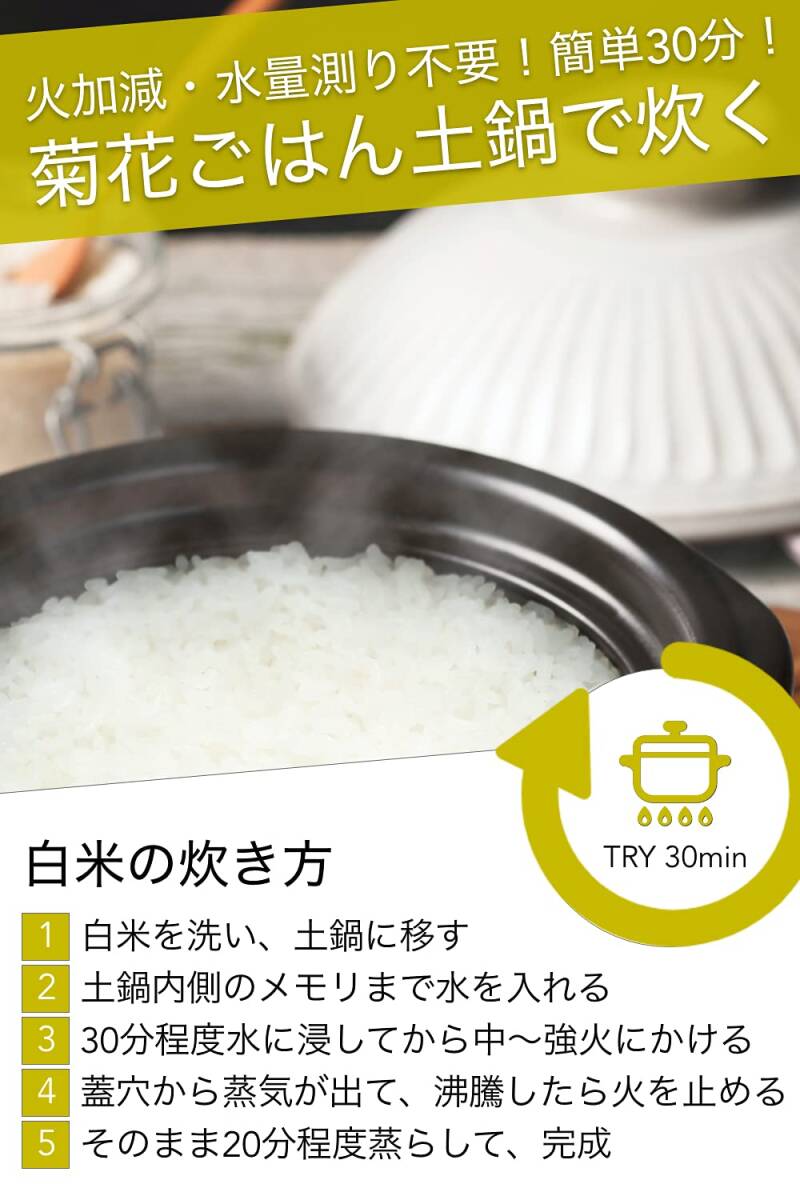 ・【簡単にごはんが炊ける土鍋】誰でも簡単に美味しい土鍋ごはんが、たった30分で作れます。鍋の内側には水位目盛りが刻まれているため、計量カップで水を測る手間を省けます。「蒸気が見えたら火を止める」という簡単なステップで、誰でも手軽に炊き立ての美味しいごはんを楽しむことができます。菊花 ごはん土鍋2合サイズは、12合分の炊飯が可能でなので、ごはん土鍋として、ひとり暮らしの方にも嬉しいサイズ感です。