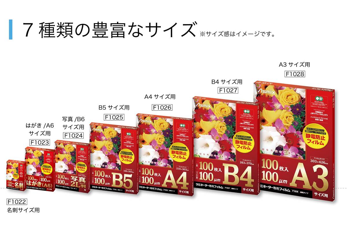 大切な用紙の保護に、ラミネーター専用フィルム 100? 100枚入り ■ゴミやほこりが付きにくい ■静電防止フィルムだから原紙を入れやすい ■3層構造で仕上りキレイ ■エコフィルムだから燃焼しても塩化水素ガスが発生しません <仕様> フィルム厚み:100? フィルム入り数:100枚 <サイズバリエーション> F1021 キャッシュカード 54×86mm F1022 名刺 60×95mm F1023 はがき(A6) 109×154mm F1024 写真2L判(B6) 134×188mm F1025 B5 188×263mm F1026 A4 216×303mm F1027 B4 263×370mm F1028 A3 303×426mm