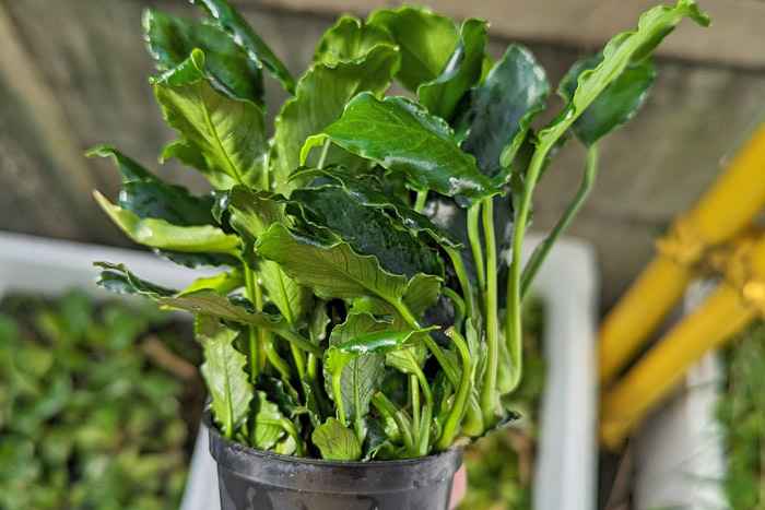 アヌビアスの仲間は水中葉、水上葉の区別はありません。輸入水草ですので農薬の使用の有無は判断ができませんので2-3週間隔離されてからの導入が安全です。