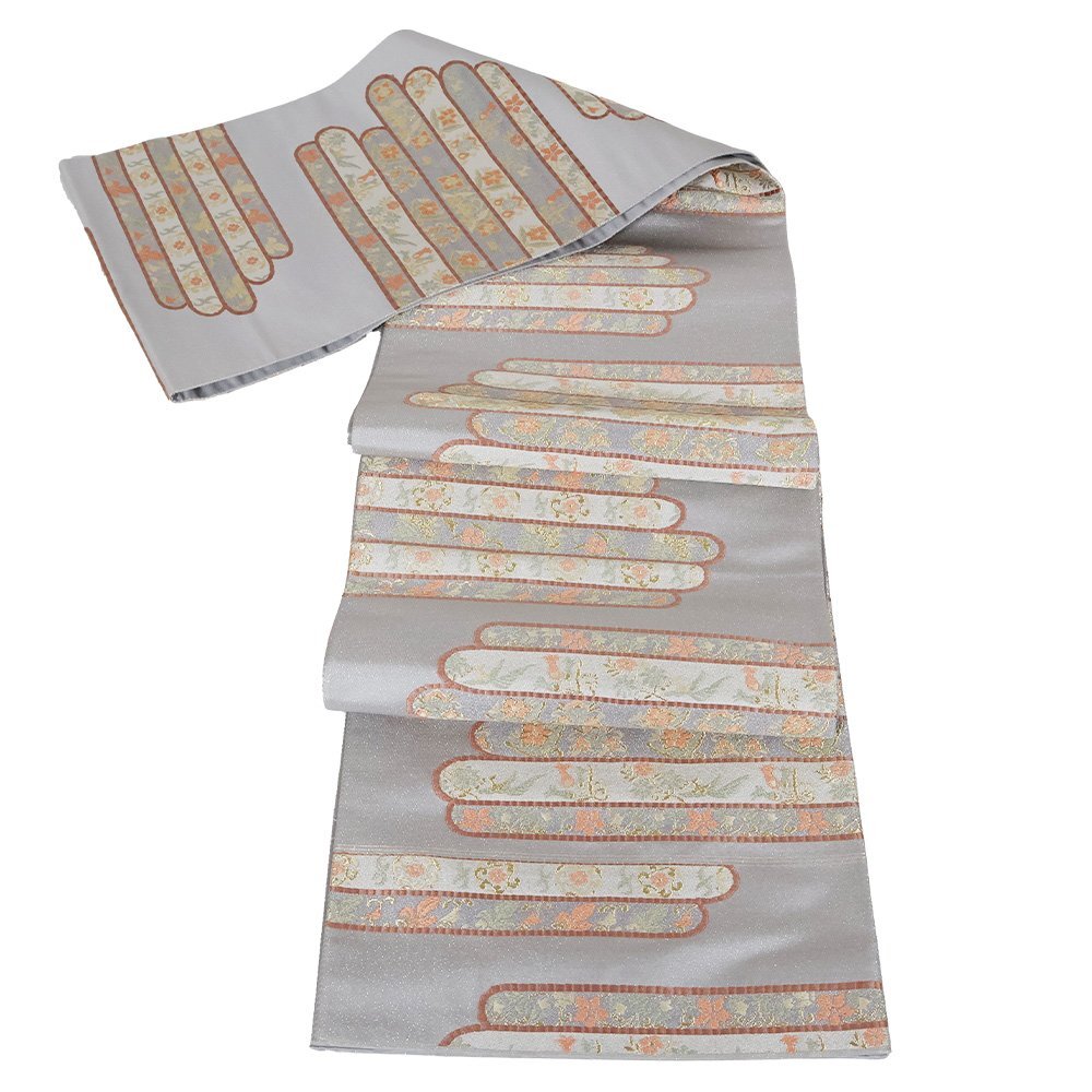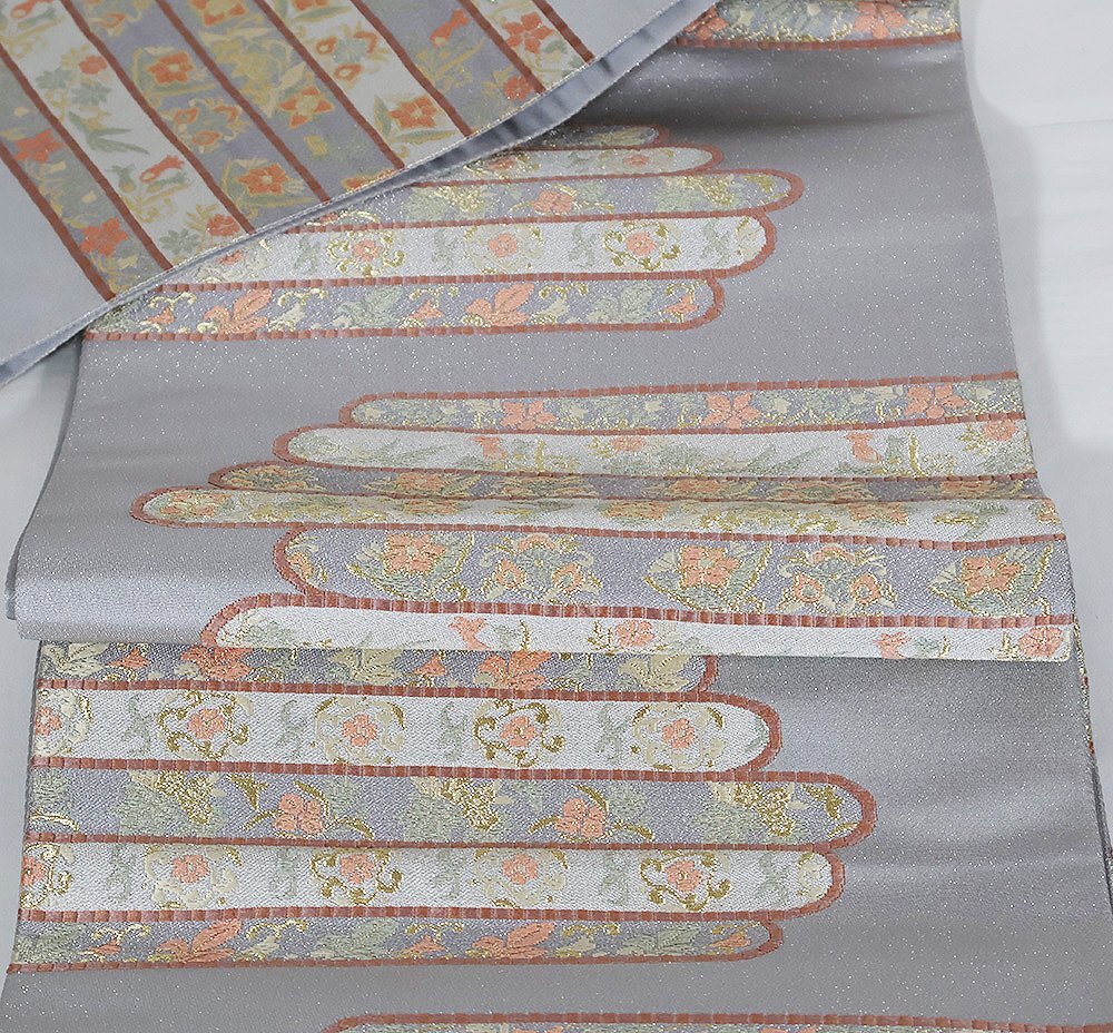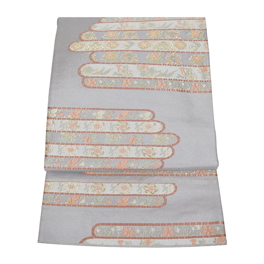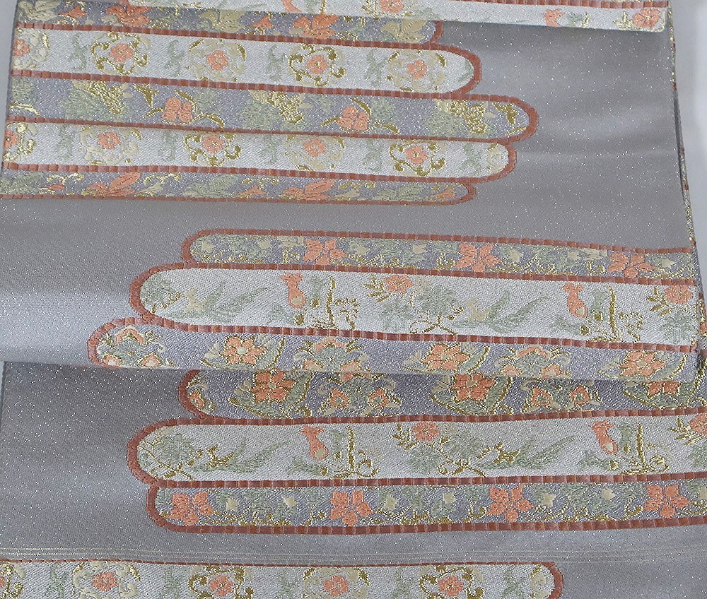 | 西陣織袋帯 グレー・銀糸通し地 縫い取り・花喰鳥・唐花・霞文 未使用品 仕立て上がり | |