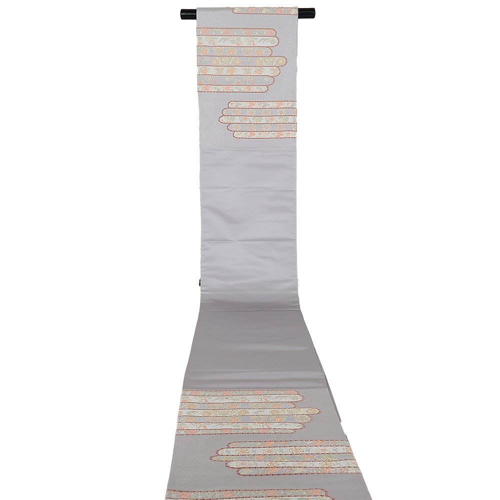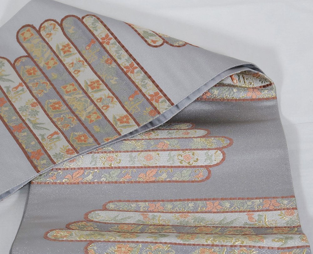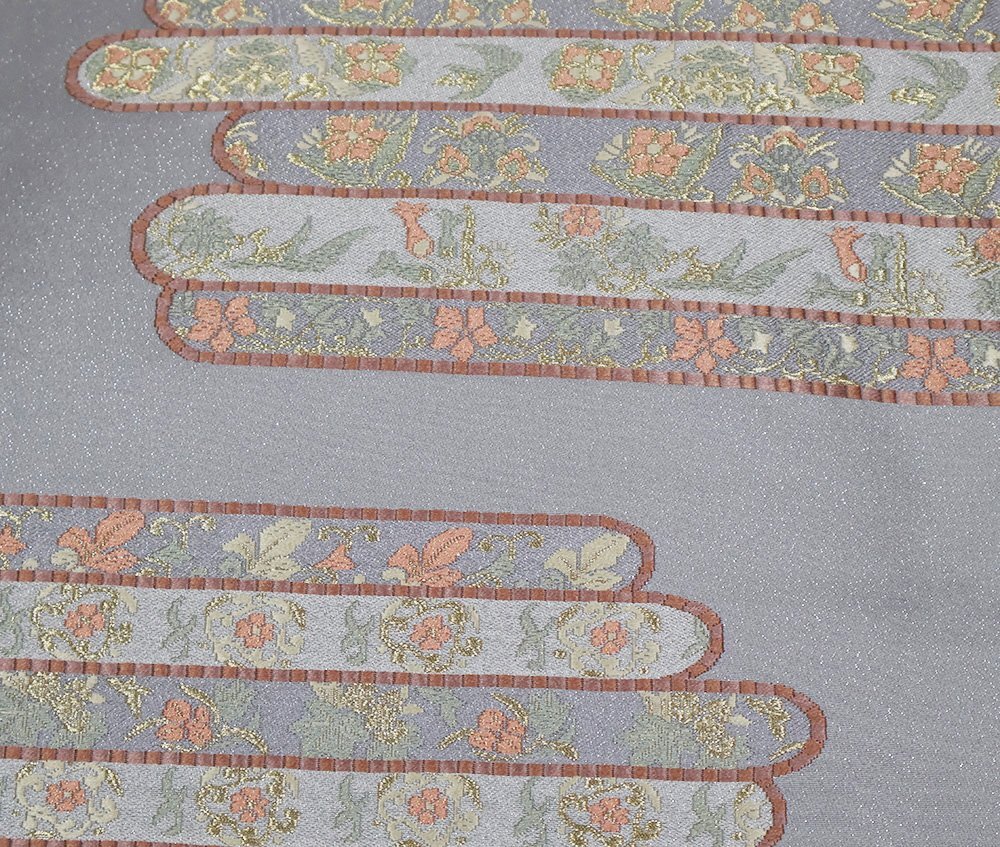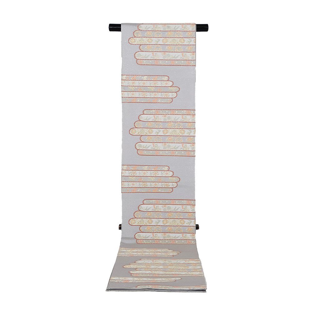 | 西陣織袋帯 グレー・銀糸通し地 縫い取り・花喰鳥・唐花・霞文 未使用品 仕立て上がり | |