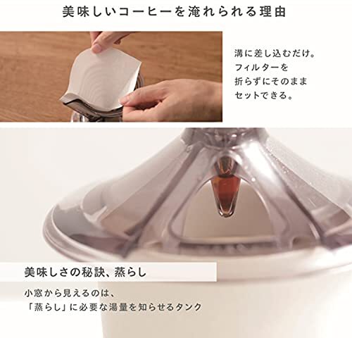 ・【蒸らしのタイミングがわかる】沸騰したお湯でゆっくりと粉全体を湿らせる「蒸らし」は、コーヒーの美味しい成分を抽出するための大切なステップ。タンクにコーヒーが落ち始めたら「蒸らし」のお湯をストップするサインです。小窓からコーヒーの落ちる様子が見えるので、カップに注がれた量がわかりやすくなっています。