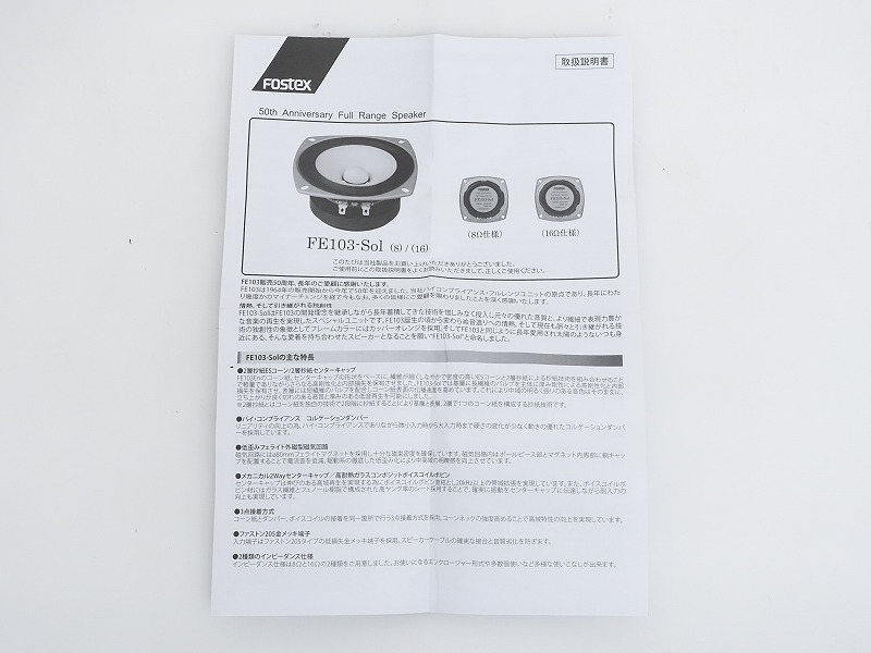 ■メーカー : FOSTEX ■型番 : FE103-Sol ■インピーダンス : 8Ω ※ペアでの出品となります。 【商品の状態 当店での確認内容】 本商品は動作確認は行っておらず、詳細な状態については保証いたしかねます。 ※上記により【現状商品】としての出品となります。 「商品の状態」に関しましては当方主観の目安となります。外観などは中古品で個人差もありますので詳細は画像にてご判断ください。 画像にて不明な点はご質問下さい。 出品商品は画像のものですべてになります。画像に写っているもの以外は付属いたしません。 ※注意※ ヤフオクのシステム上、送料表記が送料未定となっておりますが、送料に関しては全て有償となりますので下記を参照下さい。 【送料 全国一律 950 円 沖縄、離島は別途お見積り】 ※送料がお得になるサービスです(下取りシステムのご案内です) ストア決済利用時にクレジットカードやPayPay残高/PayPayクレジットを利用の方は留意点がございますのでこちらを参照上ご利用ください。 当ストアでは商品を安全にお届け出来るよう提携運送会社と協議の上、発泡緩衝材や強度段ボールの使用等 運送会社が指定する梱包方法や資材を採用しております。 より安全にお届け出来るよう商品仕様により梱包サイズが大きくなる場合や個口数が増える事がございます。 【当ストアオークションルールを入札前に必ずご確認ください。】 【落札後の取引手順】 ・落札後は取引ナビにて、必要事項をご入力後、送信ください。 取引終了後48時間(土、日は除く)以内に入力をお願い致します。 ※ご連絡が頂けない場合は落札者様都合でのキャンセルとさせていただきます。 ・落札代金(商品代金+消費税+送料)の入金をお願い致します。 ※大型商品の場合は送料確定後の決済となる為取引ナビを入力頂き、当ストアより送料のご案内が来るまでお待ちください。(土曜、日曜、祝日の場合は翌営業日より順次ご案内いたします) ・お支払い方法はクレジットカード/PayPay残高/PayPayクレジット/PayPay銀行/ゆうちょ銀行のみです。 ※商品代金引換(代引き)のお取り扱いはしておりません。 ※領収証の発行が必要な方はご連絡ください。 ※銀行振込の際の振込手数料はご負担願います。 ・入金確認後に出荷手配を致します。 (原則入金確認後3営業日以内に発送いたしますが、大型や重量のある製品はお時間をいただく場合もございます。) ・発送は当店指定の運送会社の元払いのみでの発送となります。 ※他の運送会社、送料代引き等は致しかねます。 ※落札者様ご自身での運送会社の手配いただく事も可能ですが荷物事故の責任の所在の問題上、梱包は致しかねます。 ※店頭にお越し頂き手渡しも可能(福岡市早良区)です。ご希望の方はご落札後にご連絡下さい。 ・大型/重量物商品の送料につきましては商品の特性上、荷降ろし状況等により送料が大きく前後し運送業者に別途見積りが必要な為、早めのお問い合わせにてお見積り上、入札をお願い致します。 【初期不良の保証について】 ・商品到着後の初期動作不良、また配送中の事故による破損、不具合が有る場合は、商品発送後10日以内に当ストアまでご連絡ください。当ストアでは修理での対応を優先させて頂きますが、修理不可の場合は全額返金させて頂きます。 (商品代金+消費税+送料のお支払い頂いた金額となります) 【初期不良の保証の対象外について】 次の場合は保証の対象外となりますのご留意ください ・ジャンク商品、現状商品、難あり商品での出品商品。 ※難あり商品に関しましては動作確認時に一部動作不良が確認された商品になり、記載している動作確認以外にも、動作不良がある可能性もございます。こちらに関しましても保証対象外となりますことをご理解ください。 ・年代物のオーディオなどで、当店にてわからない範囲で部品が交換されている場合 ・楽器類の特殊機材(マイクロスコープ等)での確認までは行っておりません。気になる方は事前にご質問いただくか、入札をお控えください。 ※初期不良に関しましては【商品の状態】に記載のもの、またそれによって起因する動作不良は対象外です。 ※商品発送後10日を過ぎてのご連絡は対応が出来ませんので、商品が到着しましたらお早めに確認をお願い致します。 【メーカー保証の加入・継承】 ・未使用品、展示品やメーカー保証期間が残っている商品に関しまして、メーカー保証の加入、継承が必要な方は、落札後取引ナビ内にて当ストアにお知らせください。商品発送までにご連絡いただけない場合、メーカー保証の手続きを承れない場合があります。 【評価について】 ・評価不要の場合、必ず取引ナビの「要望欄」にてお知らせください。それ以外でご連絡をいただいた場合、対応できない可能性がございます。一度行った評価はシステム上取り消しが行えませんのでご了承ください。 【入札削除・キャンセルについて】 ・入札後はトラブル防止の為いかなる事情がおきまして