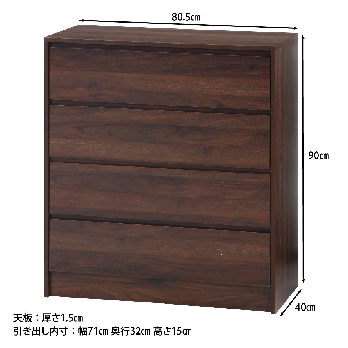 | 備 考 | ■工具不要の簡単組み立て仕様です。 ■収納力抜群の4段チェストです。 ■おしゃれな木目調カラーです。 |
