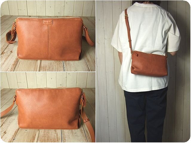 味わい深いムラとシボが入った合皮を使用しており、デイリー使いに馴染むバッグです。500mlのペットボトルと長財布が同時に収納でき、小さめの型押しネームがアクセントになっています。