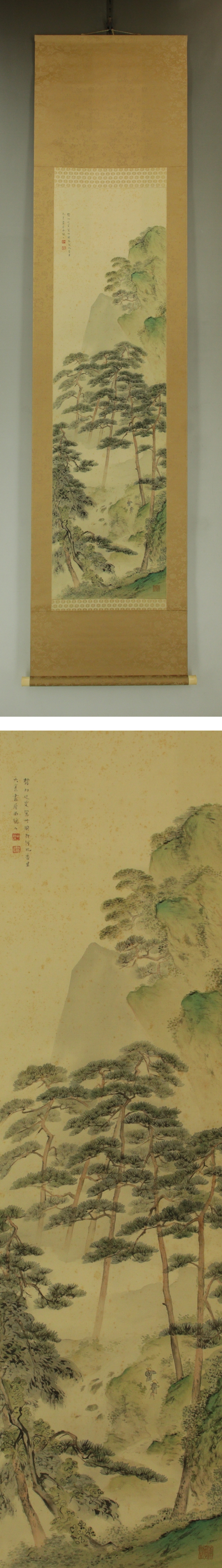 矢野橋村 やの-きょうそん(1890-1965) 大正-昭和時代の日本画家。 明治23年9月8日生まれ。矢野鉄山の叔父。永松春洋に学ぶ。 日本南画院同人となり、大正13年私立大阪美術学校を創立。 昭和36年「錦楓」で芸術院賞。39年日本南画院会長。 吉川英治、長谷川伸の小説の挿絵でも知られる。昭和40年4月17日死去。74歳。 愛媛県出身。本名は一智(かずとし)。 本紙は、染み、汚れ、ヤケがあります。 表装は、染み、汚れ、皺、軸先に擦れがあります。 【サイズ】 作品 横約35.5cm×縦約129cm 表装 横約49cm×縦約204cm |