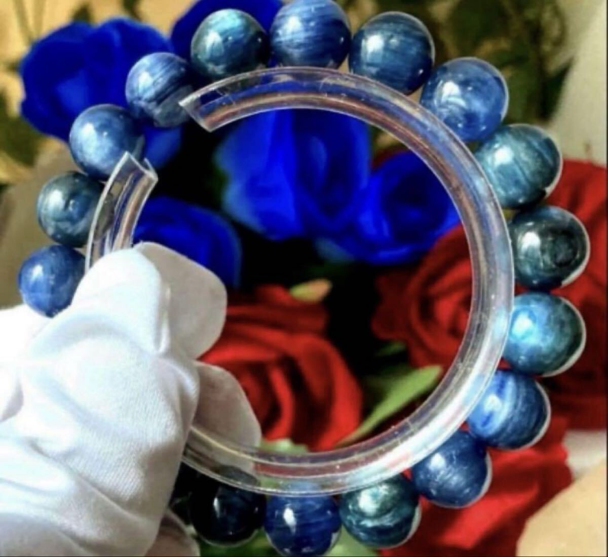 ビーズの保護のため、カイアナイトのブレスレットは着色の無いお品物は透明剤の含浸処理が施されています。