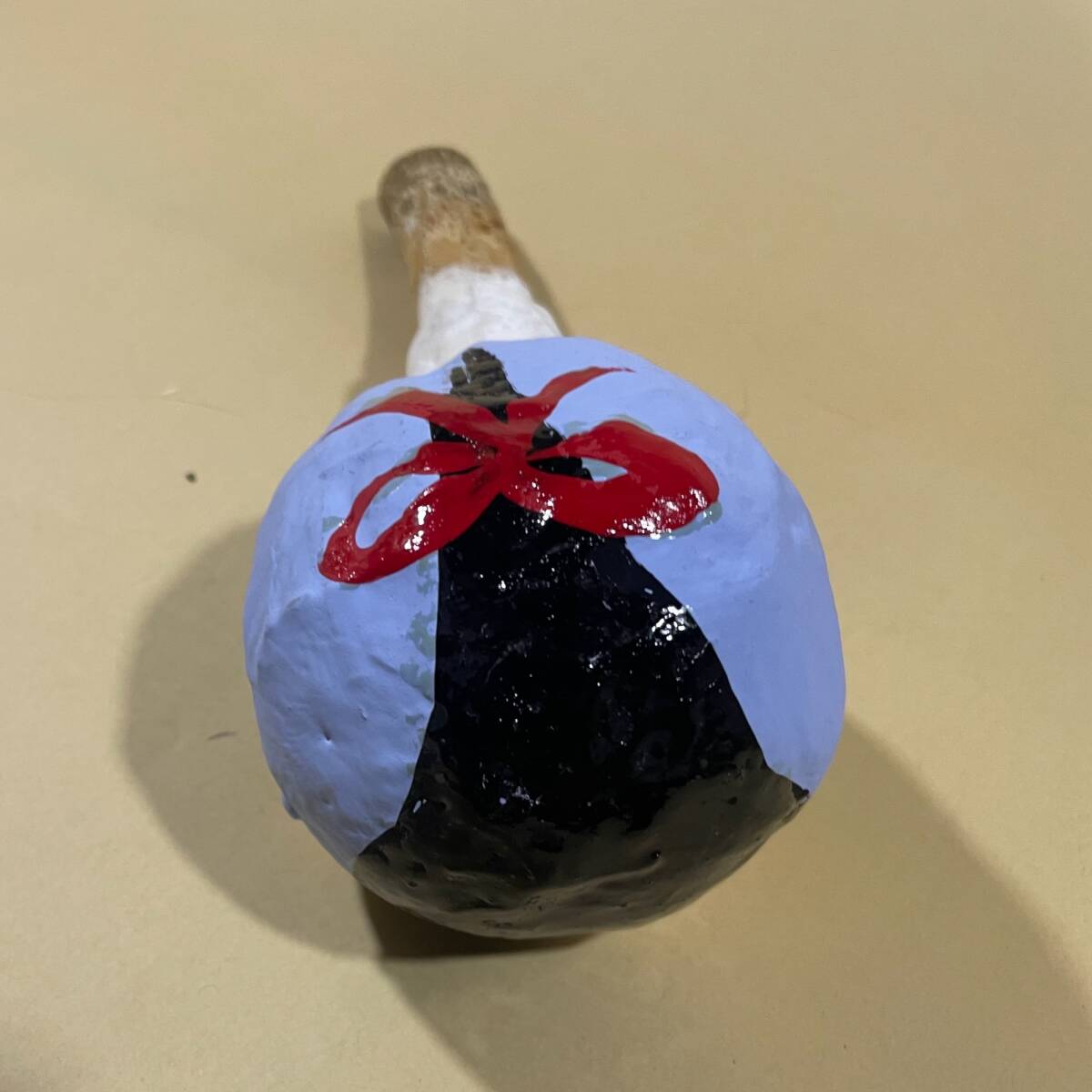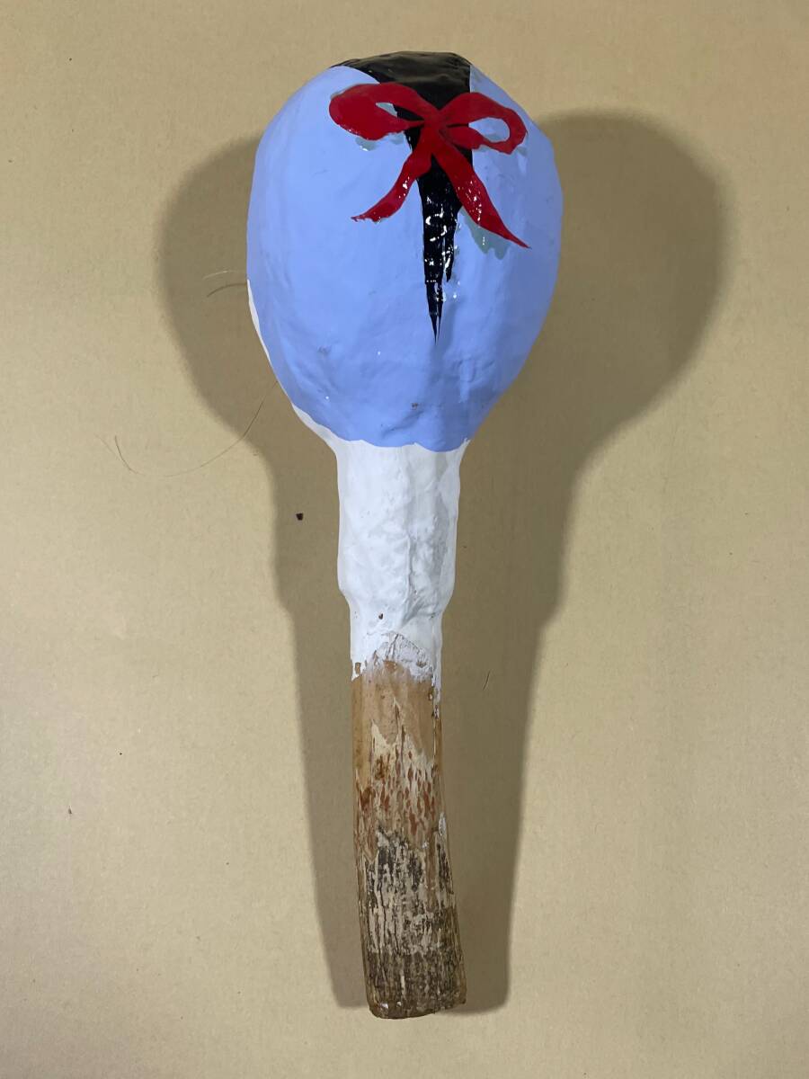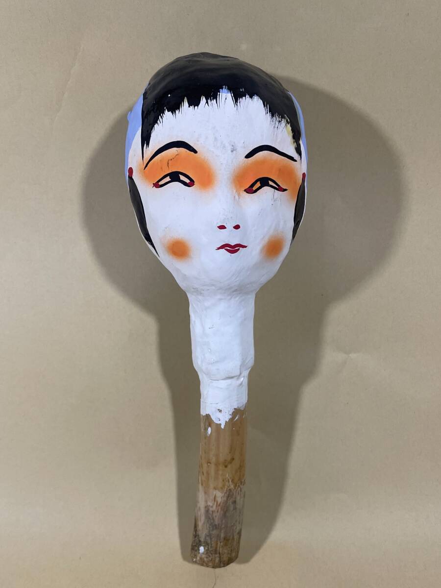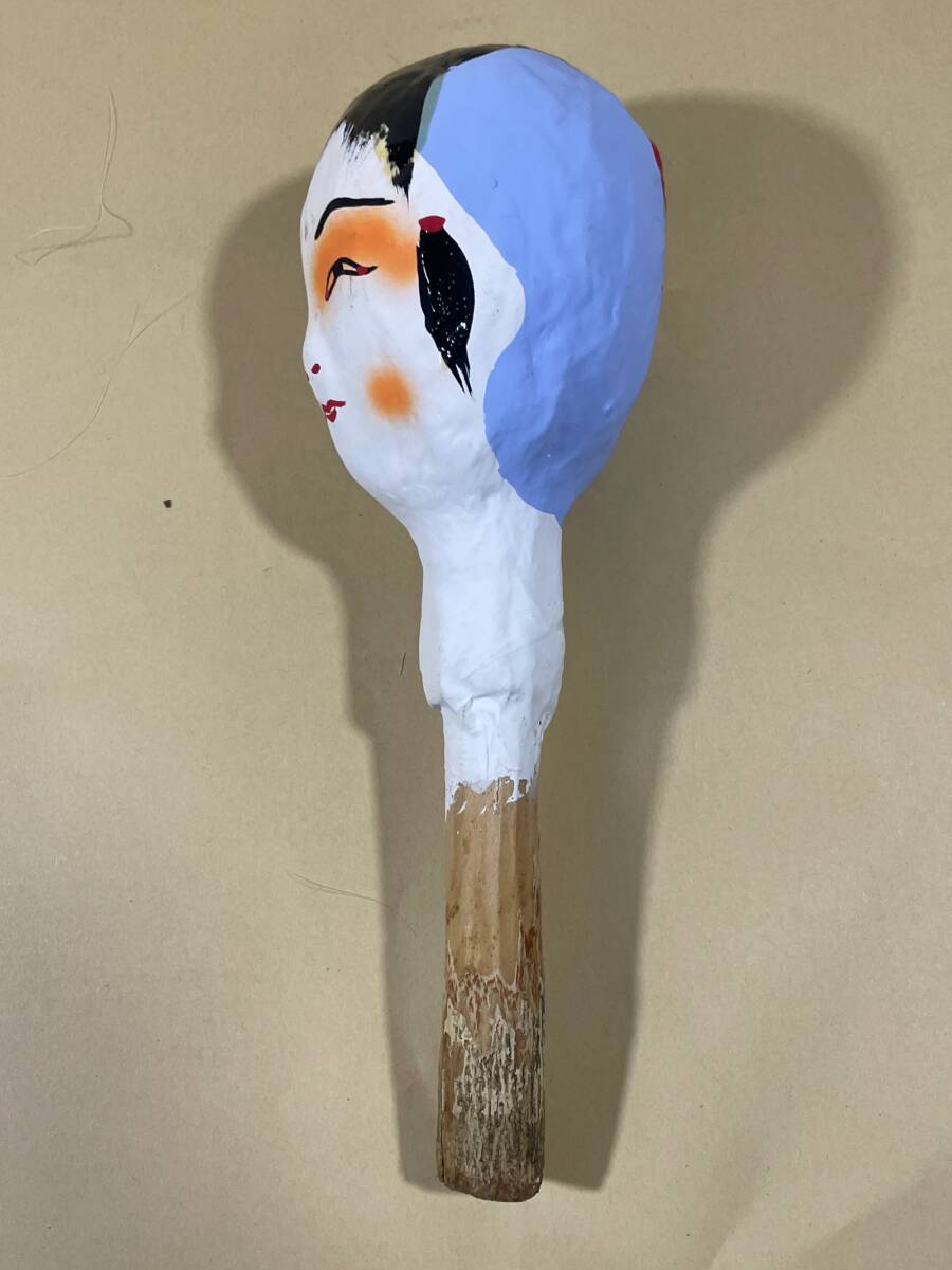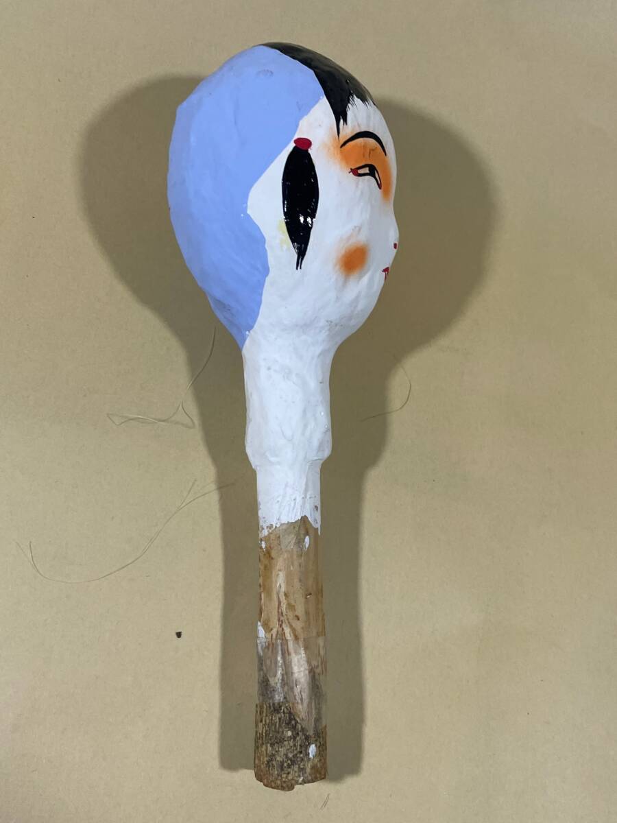本作は先代の本郷けさのによる『おぼこ』。 張子製の男の子の首に木製の柄をつけたもの。 その昔、藩主の幼い若君の手遊び用として、軽くて危険のない張子人形を作り、これを藩士が献上したのが始まりという言い伝えがあります。
