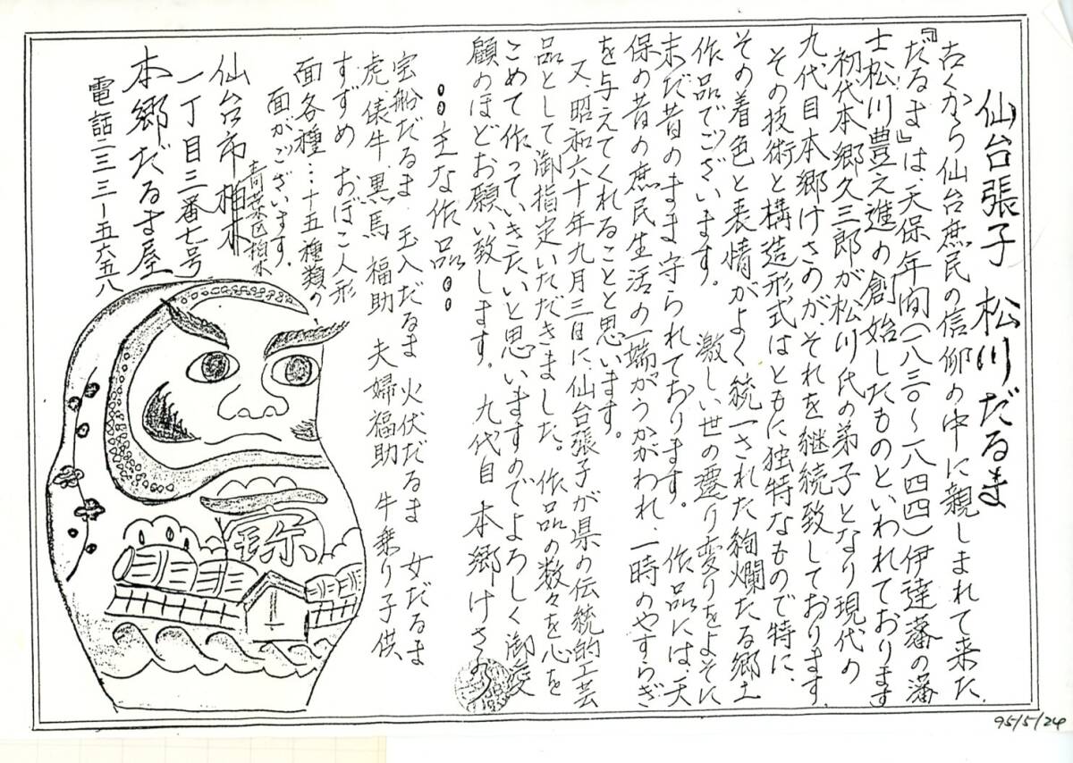 説明:仙台張子は江戸時代から続く伝統工芸品です。仙台藩士 松川豊之進が創始した『松川だるま』が最も有名で、正月の縁起物として古くから市内の歳の市で売られていたそうです。本郷だるま店の初代本郷久三郎が技法を受け継ぎ現在は十代目久孝・尚子夫婦が昔の製法を守り、伝統を踏襲して様々な作品を制作されています。仙台張子は昭和60年(1985年)に宮城県知事指定伝統的工芸品に指定されました。